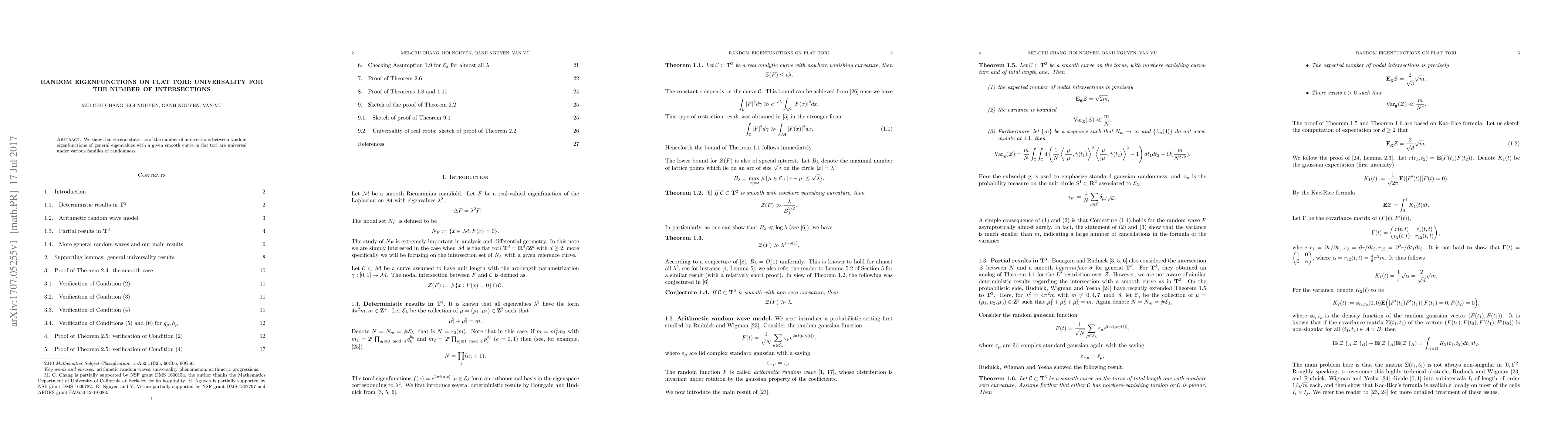 Summary: This paper demonstrates that the statistics of intersections between random eigenfunctions of general eigenvalues and a fixed smooth curve on flat tori exhibit universality across various randomness models. The findings highlight consistent behavior regardless of specific random conditions.