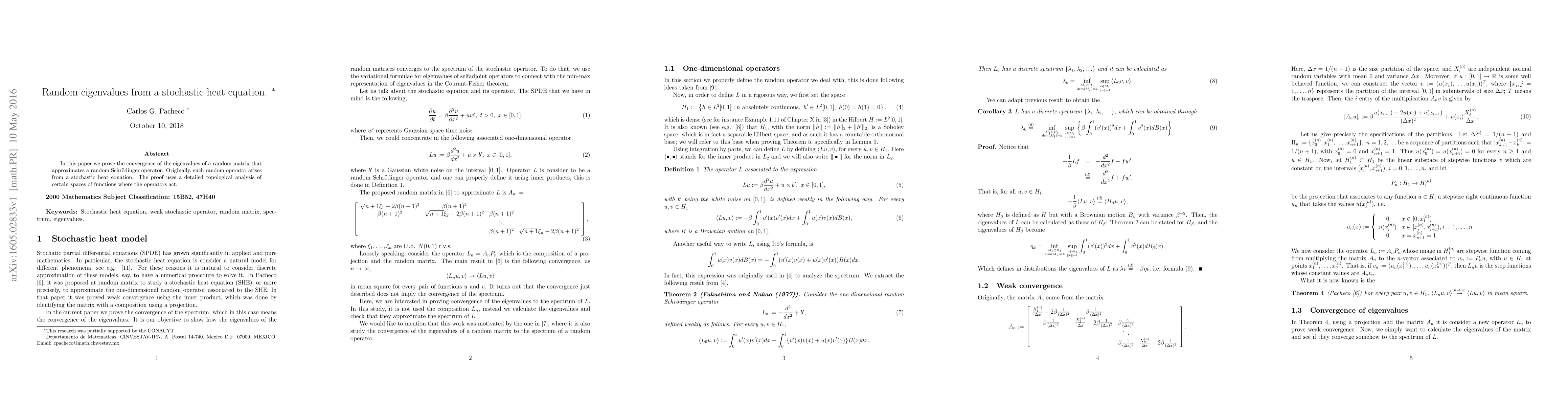 This research paper proves the convergence of eigenvalues in a random matrix approximating a random Schrödinger operator, originating from a stochastic heat equation. The proof leverages a thorough topological examination of function spaces under operator action.