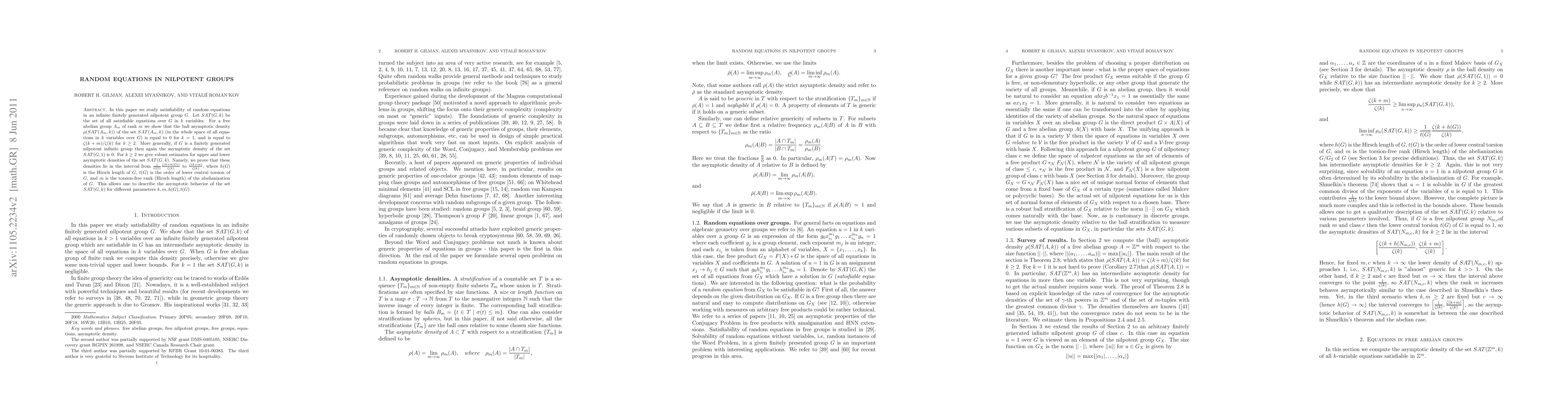 This paper investigates the satisfiability of random equations in infinite finitely generated nilpotent groups, demonstrating that the set of satisfiable equations in k variables has an intermediate asymptotic density. For free abelian groups, the exact density is computed, while for other groups, bounds are provided, highlighting new examples of sets with non-trivial intermediate asymptotic densities.