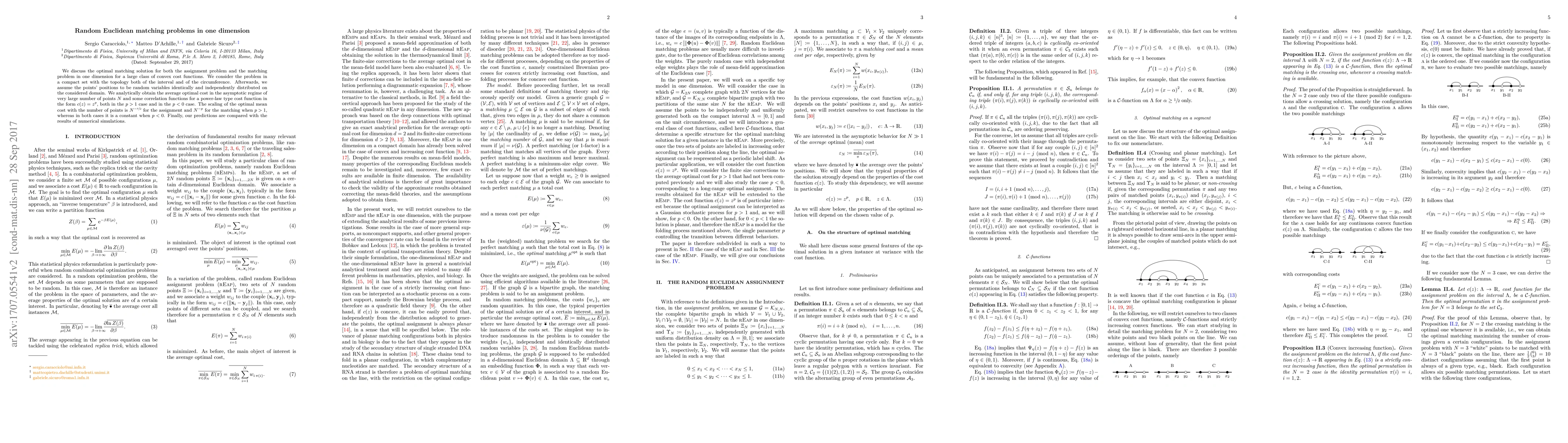We discuss the optimal matching solution for both the assignment problem and the matching problem in one dimension for a large class of convex cost functions. We consider the problem in a compact set with the topology both of the interval and of the circumference. Afterwards, we assume the points' positions to be random variables identically and independently distributed on the considered domain. We analytically obtain the average optimal cost in the asymptotic regime of very large number of points $N$ and some correlation functions for a power-law type cost function in the form $c(z)=z^p$, both in the $p>1$ case and in the $p<0$ case. The scaling of the optimal mean cost with the number of points is $N^{-\frac{p}{2}}$ for the assignment and $N^{-p}$ for the matching when $p>1$, whereas in both cases it is a constant when $p<0$. Finally, our predictions are compared with the results of numerical simulations.