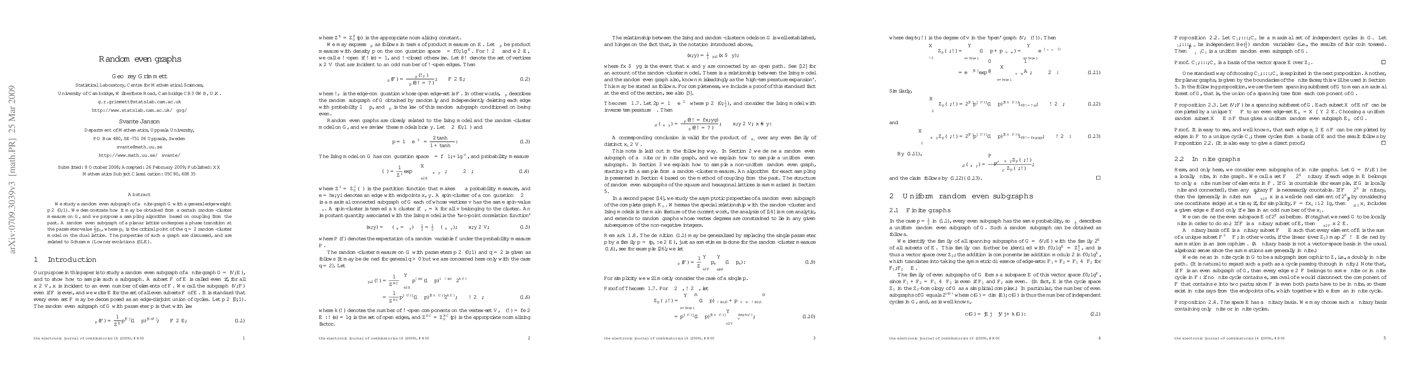 We study a random even subgraph of a finite graph $G$ with a general edge-weight $p\in(0,1)$. We demonstrate how it may be obtained from a certain random-cluster measure on $G$, and we propose a sampling algorithm based on coupling from the past. A random even subgraph of a planar lattice undergoes a phase transition at the parameter-value $\frac 12 \pc$, where $\pc$ is the critical point of the $q=2$ random-cluster model on the dual lattice. The properties of such a graph are discussed, and are related to Schramm--L\"owner evolutions (SLE).