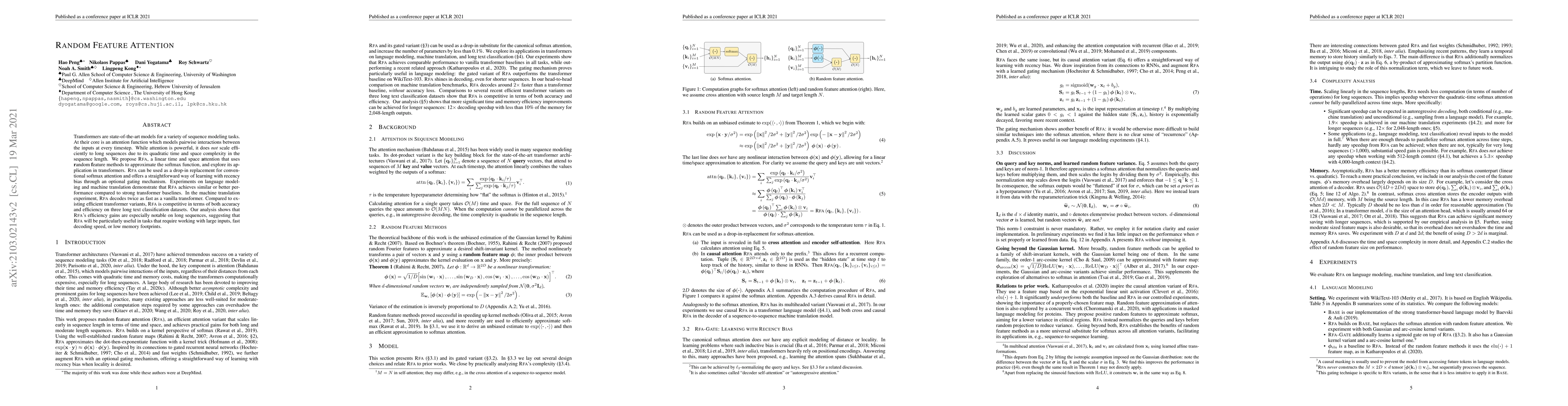 Transformers are state-of-the-art models for a variety of sequence modeling tasks. At their core is an attention function which models pairwise interactions between the inputs at every timestep. While attention is powerful, it does not scale efficiently to long sequences due to its quadratic time and space complexity in the sequence length. We propose RFA, a linear time and space attention that uses random feature methods to approximate the softmax function, and explore its application in transformers. RFA can be used as a drop-in replacement for conventional softmax attention and offers a straightforward way of learning with recency bias through an optional gating mechanism. Experiments on language modeling and machine translation demonstrate that RFA achieves similar or better performance compared to strong transformer baselines. In the machine translation experiment, RFA decodes twice as fast as a vanilla transformer. Compared to existing efficient transformer variants, RFA is competitive in terms of both accuracy and efficiency on three long text classification datasets. Our analysis shows that RFA's efficiency gains are especially notable on long sequences, suggesting that RFA will be particularly useful in tasks that require working with large inputs, fast decoding speed, or low memory footprints.