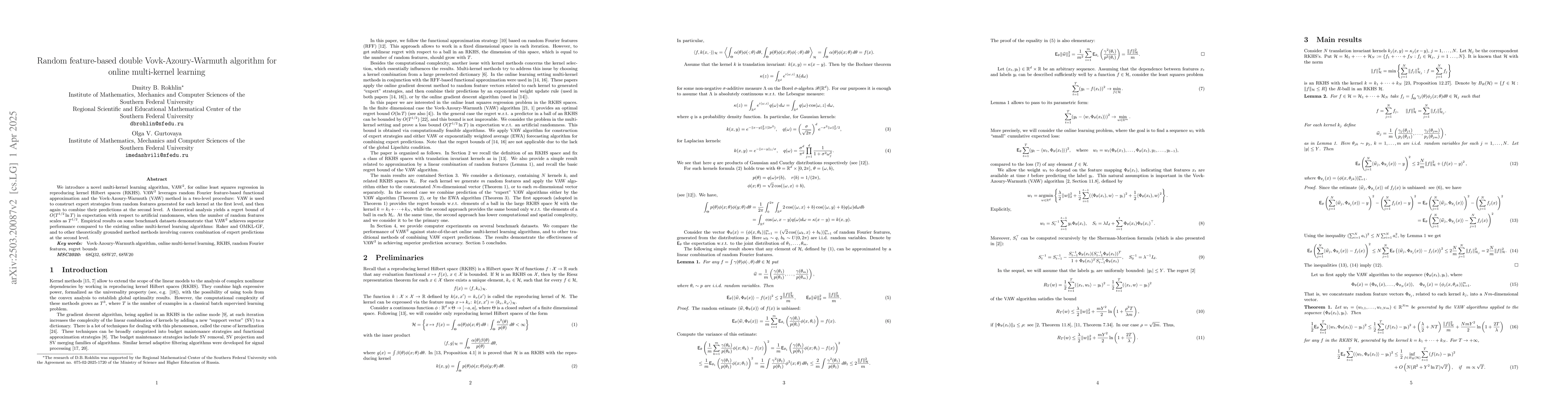 The paper presents the double Vovk-Azoury-Warmuth (VAW) algorithm for online multi-kernel learning, which uses random Fourier features and the VAW method in a two-level procedure to efficiently combine kernel predictions.