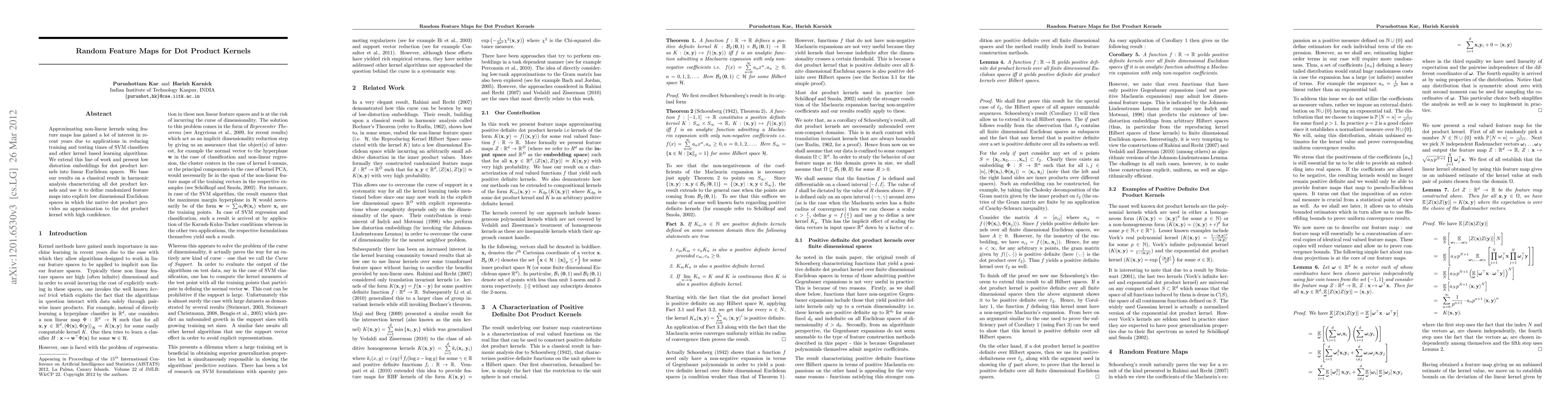 Approximating non-linear kernels using feature maps has gained a lot of interest in recent years due to applications in reducing training and testing times of SVM classifiers and other kernel based learning algorithms. We extend this line of work and present low distortion embeddings for dot product kernels into linear Euclidean spaces. We base our results on a classical result in harmonic analysis characterizing all dot product kernels and use it to define randomized feature maps into explicit low dimensional Euclidean spaces in which the native dot product provides an approximation to the dot product kernel with high confidence.