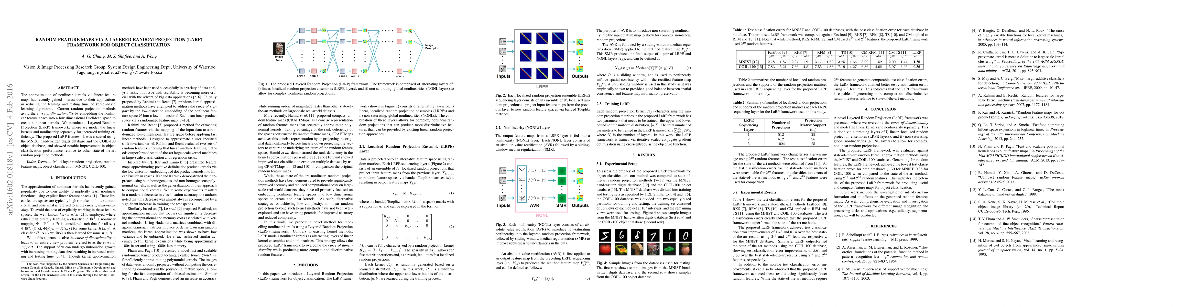 A new framework called Layered Random Projection improves object classification performance on MNIST and COIL-100 databases by separating linear and non-linear features for faster training efficiency.