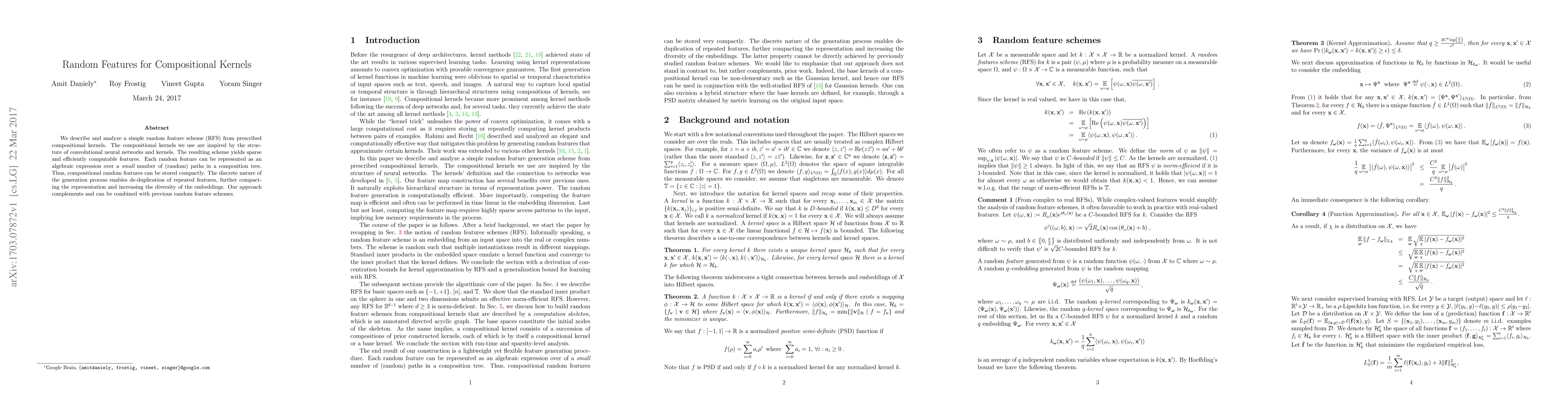 This paper proposes a random feature scheme derived from compositional kernels, inspired by convolutional neural networks, which generates sparse and efficiently computable features. The features are represented as algebraic expressions over random paths in a composition tree, enabling compact storage and de-duplication for enhanced diversity.