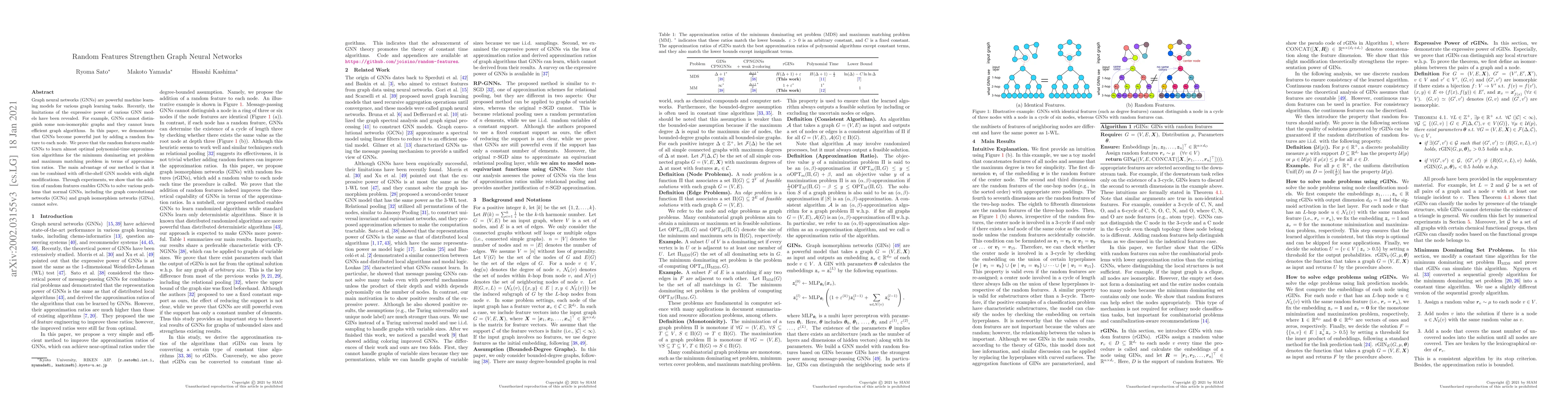 This paper shows that adding random features to nodes in graph neural networks (GNNs) significantly enhances their expressive power, enabling them to solve complex problems like the minimum dominating set and maximum matching. The method is easily integrated with existing GNN models, demonstrating improved performance on tasks beyond the capabilities of standard GNNs.