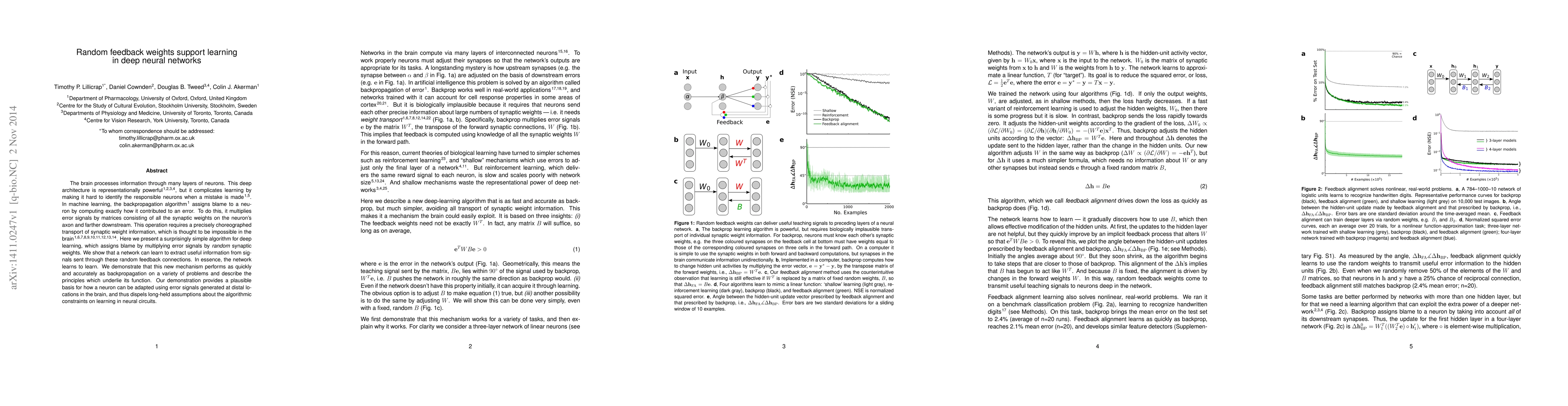 This paper proposes a novel deep learning algorithm that uses random feedback weights instead of precise synaptic weight matrices in traditional backpropagation, demonstrating that such random connections can effectively support learning in neural networks, performing comparably to conventional methods and offering insights into brain-like learning mechanisms.