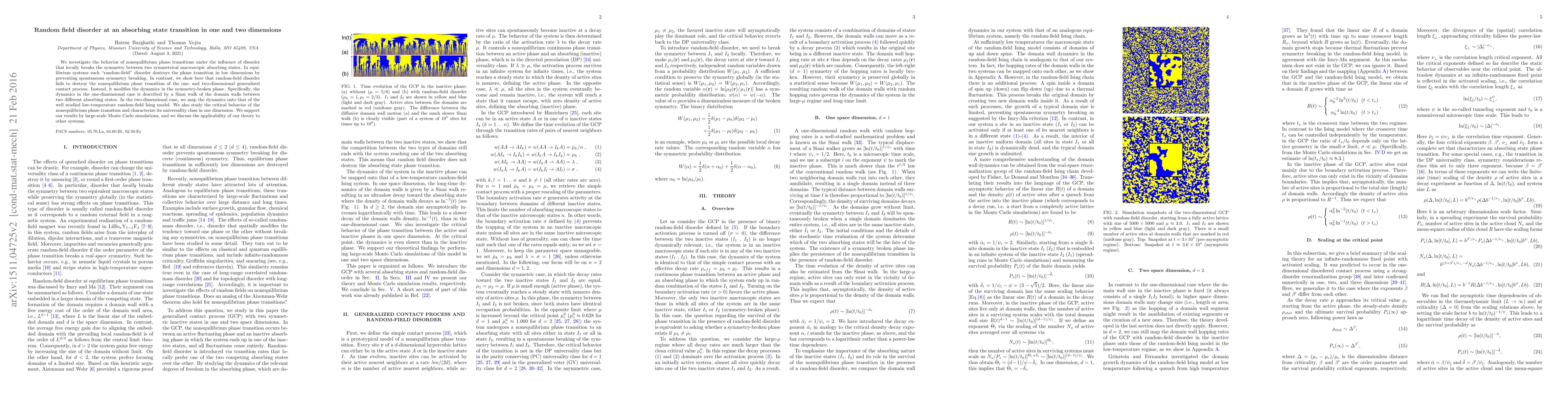 This paper explores how random-field disorder affects nonequilibrium phase transitions in one- and two-dimensional systems, demonstrating that it does not destroy the transition but modifies the dynamics, particularly through Sinai walk behavior in one dimension and mapping to the low-temperature random-field Ising model in two dimensions. The study also characterizes the critical behavior and universality class of the transition.