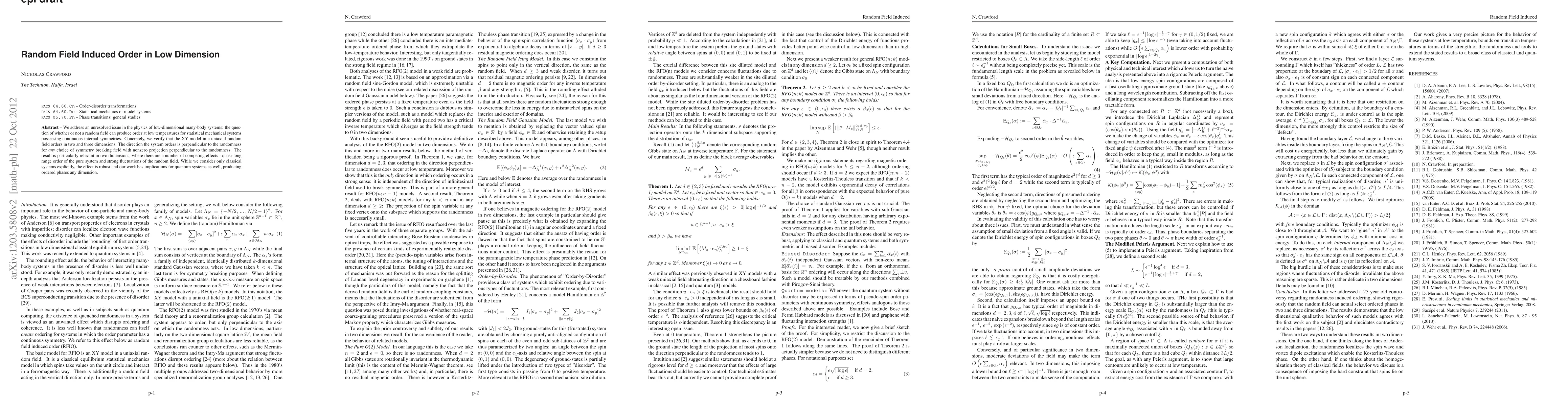 A classical model in 2D and 3D with a weak random external field along a subspace shows residual magnetic order perpendicular to the subspace. The magnitude of spin projections onto the subspace is small for k less than or equal to n-1.