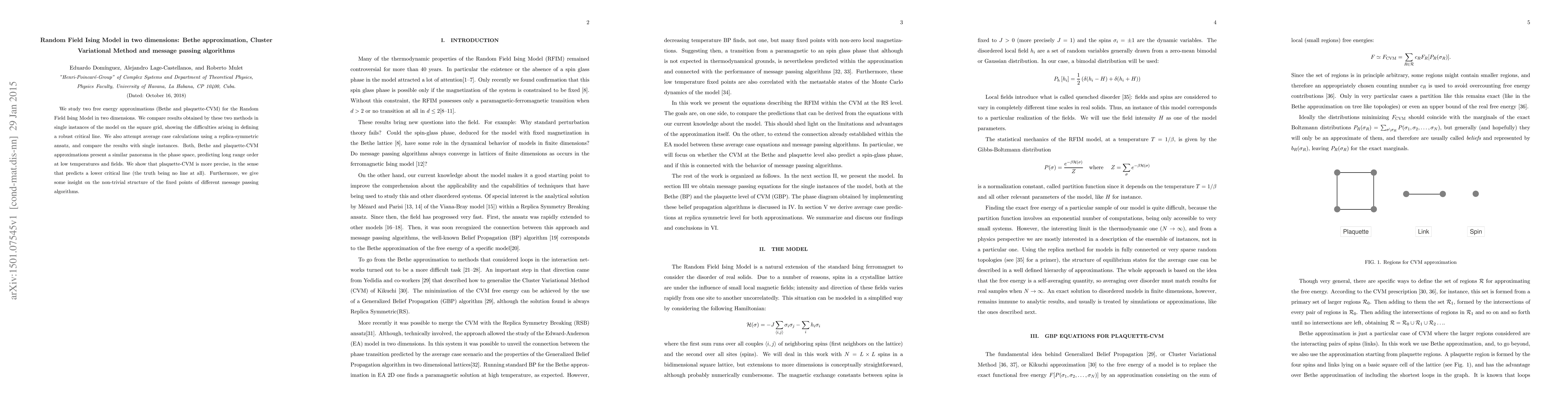 We study two free energy approximations (Bethe and plaquette-CVM) for the Random Field Ising Model in two dimensions. We compare results obtained by these two methods in single instances of the model on the square grid, showing the difficulties arising in defining a robust critical line. We also attempt average case calculations using a replica-symmetric ansatz, and compare the results with single instances. Both, Bethe and plaquette-CVM approximations present a similar panorama in the phase space, predicting long range order at low temperatures and fields. We show that plaquette-CVM is more precise, in the sense that predicts a lower critical line (the truth being no line at all). Furthermore, we give some insight on the non-trivial structure of the fixed points of different message passing algorithms.