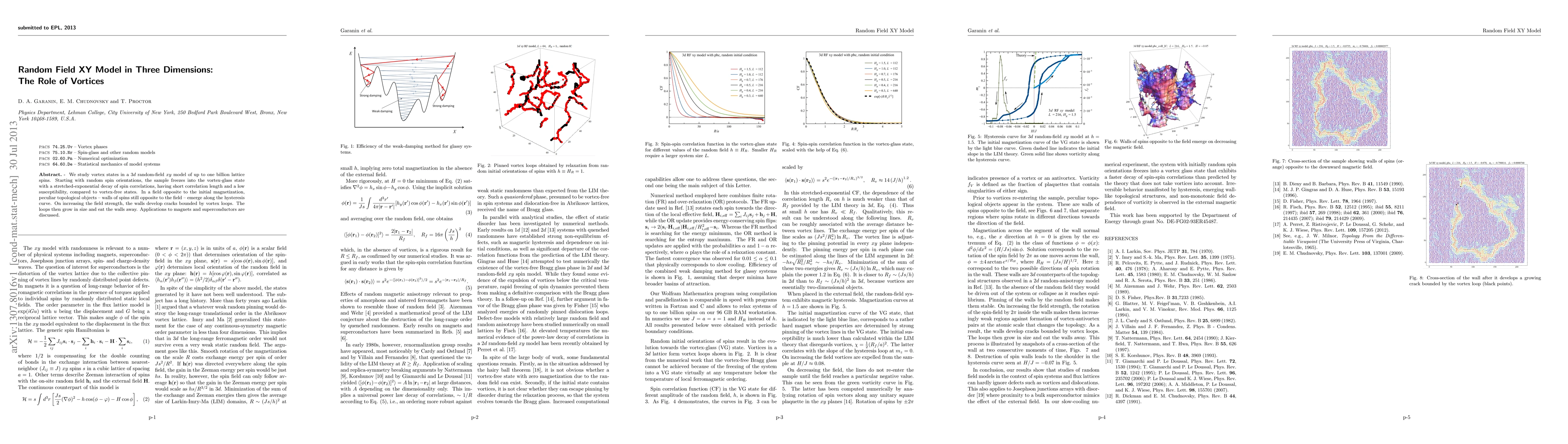 We study vortex states in a 3d random-field XY model of up to one billion lattice spins. Starting with random spin orientations, the sample freezes into the vortex-glass state with a stretched-exponential decay of spin correlations, having short correlation length and a low susceptibility, compared to vortex-free states. In a field opposite to the initial magnetization, peculiar topological objects -- walls of spins still opposite to the field -- emerge along the hysteresis curve. On increasing the field strength, the walls develop cracks bounded by vortex loops. The loops then grow in size and eat the walls away. Applications to magnets and superconductors are discussed.