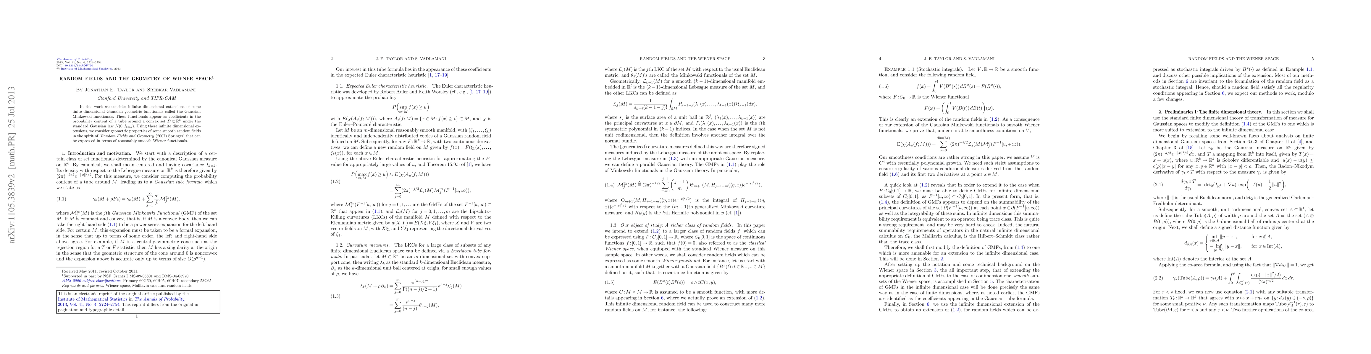 This paper explores the geometry of infinite-dimensional Gaussian random fields, extending finite-dimensional Gaussian Minkowski functionals to Wiener space, with implications for understanding smooth random fields.