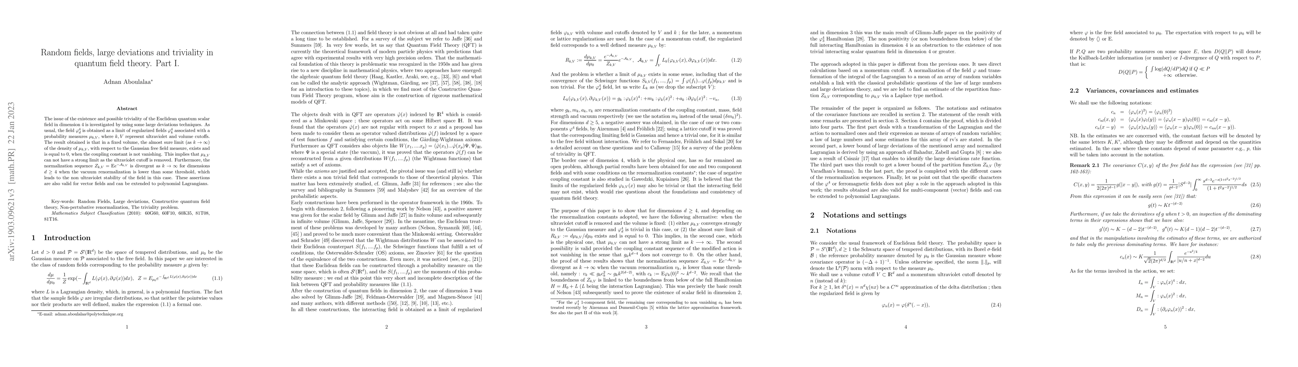 The issue of the existence and possible triviality of the Euclidean quantum scalar field in dimension 4 is investigated by using some large deviations techniques. As usual, the field $\varphi_{d}^{4}$ is obtained as a limit of regularized fields $\varphi_{k}^{4}$ associated with a probability measures $\mu_{k,V}$, where $k, V$ represent ultraviolet and volume cutoffs. The result obtained is that in a fixed volume, the almost sure limit (as $k \rightarrow \infty$) of the density of $\mu_{k,V}$, with respect to the Gaussian free field measure, exists and is equal to $0$, when the coupling constant is not vanishing. This implies that $\mu_{k,V}$ can not have a strong limit as the ultraviolet cutoff is removed. Furthermore, the normalization sequence $Z_{k,V}=E e^{-{\cal A}_{k,V}}$ is divergent as $k \rightarrow \infty$ for dimensions $d\geq4$ when the vacuum renormalization is lower than some threshold, which leads to the non ultraviolet stability of the field in this case. These assertions are also valid for vector fields and can be extended to polynomial Lagrangians.