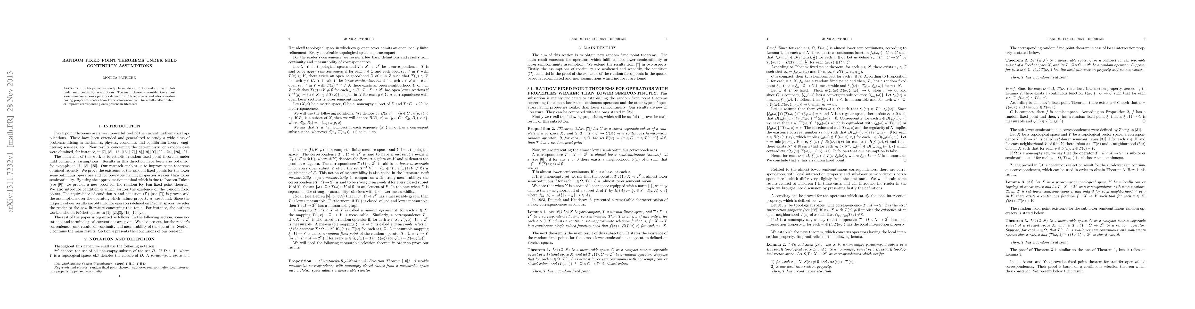 In this paper, we study the existence of the random fixed points under mild continuity assumptions. The main theorems consider the almost lower semicontinuous operators defined on Frechet spaces and also operators having properties weaker than lower semicontinuity. Our results either extend or improve corresponding ones present in literature.