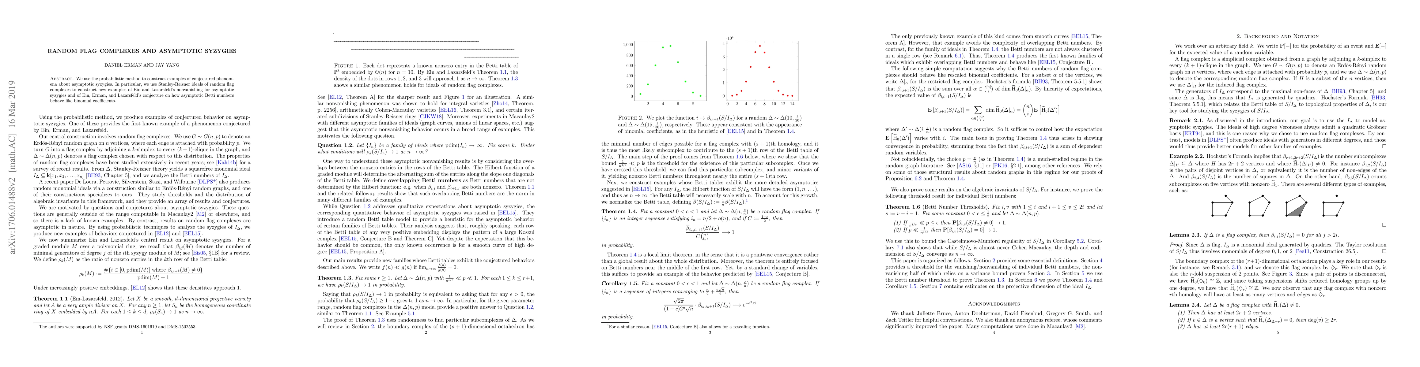 This paper utilizes the probabilistic method to build examples of asymptotic syzygies via Stanley-Reisner ideals of random flag complexes, demonstrating Ein and Lazarsfeld's nonvanishing conjecture and exploring Ein, Erman, and Lazarsfeld's conjecture on the asymptotic normal distribution of Betti numbers.