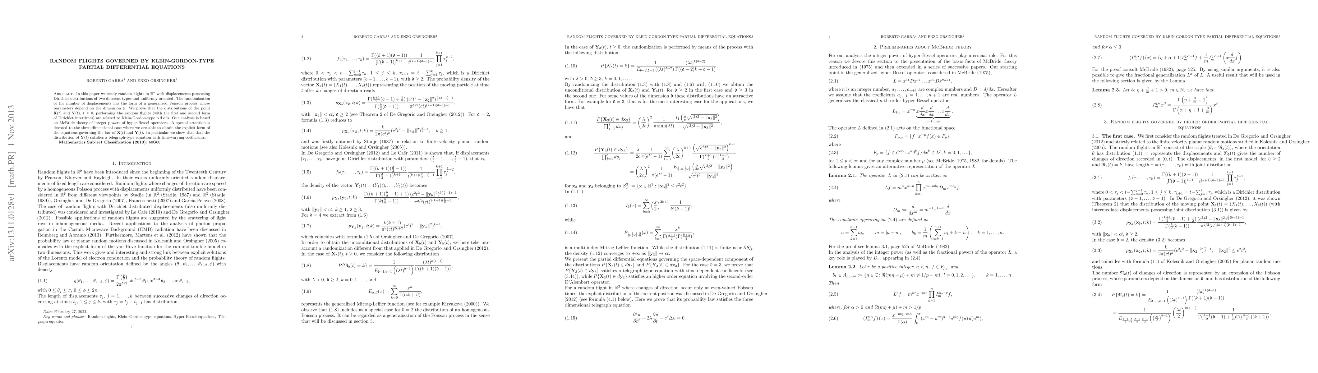 In this paper we study random flights in R^d with displacements possessing Dirichlet distributions of two different types and uniformly oriented. The randomization of the number of displacements has the form of a generalized Poisson process whose parameters depend on the dimension d. We prove that the distributions of the point X(t) and Y(t), t \geq 0, performing the random flights (with the first and second form of Dirichlet intertimes) are related to Klein-Gordon-type partial differential equations. Our analysis is based on McBride theory of integer powers of hyper-Bessel operators. A special attention is devoted to the three-dimensional case where we are able to obtain the explicit form of the equations governing the law of X(t) and Y(t). In particular we show that that the distribution of Y(t) satisfies a telegraph-type equation with time-varying coefficients.