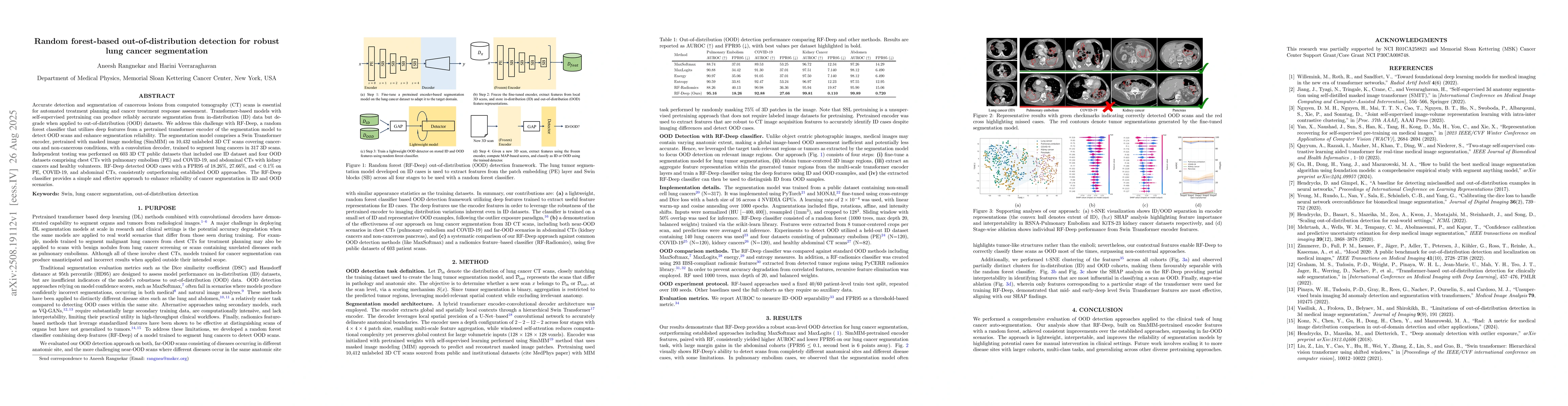 Accurate detection and segmentation of cancerous lesions from computed tomography (CT) scans is essential for automated treatment planning and cancer treatment response assessment. Transformer-based models with self-supervised pretraining can produce reliably accurate segmentation from in-distribution (ID) data but degrade when applied to out-of-distribution (OOD) datasets. We address this challenge with RF-Deep, a random forest classifier that utilizes deep features from a pretrained transformer encoder of the segmentation model to detect OOD scans and enhance segmentation reliability. The segmentation model comprises a Swin Transformer encoder, pretrained with masked image modeling (SimMIM) on 10,432 unlabeled 3D CT scans covering cancerous and non-cancerous conditions, with a convolution decoder, trained to segment lung cancers in 317 3D scans. Independent testing was performed on 603 3D CT public datasets that included one ID dataset and four OOD datasets comprising chest CTs with pulmonary embolism (PE) and COVID-19, and abdominal CTs with kidney cancers and healthy volunteers. RF-Deep detected OOD cases with a FPR95 of 18.26%, 27.66%, and less than 0.1% on PE, COVID-19, and abdominal CTs, consistently outperforming established OOD approaches. The RF-Deep classifier provides a simple and effective approach to enhance reliability of cancer segmentation in ID and OOD scenarios.