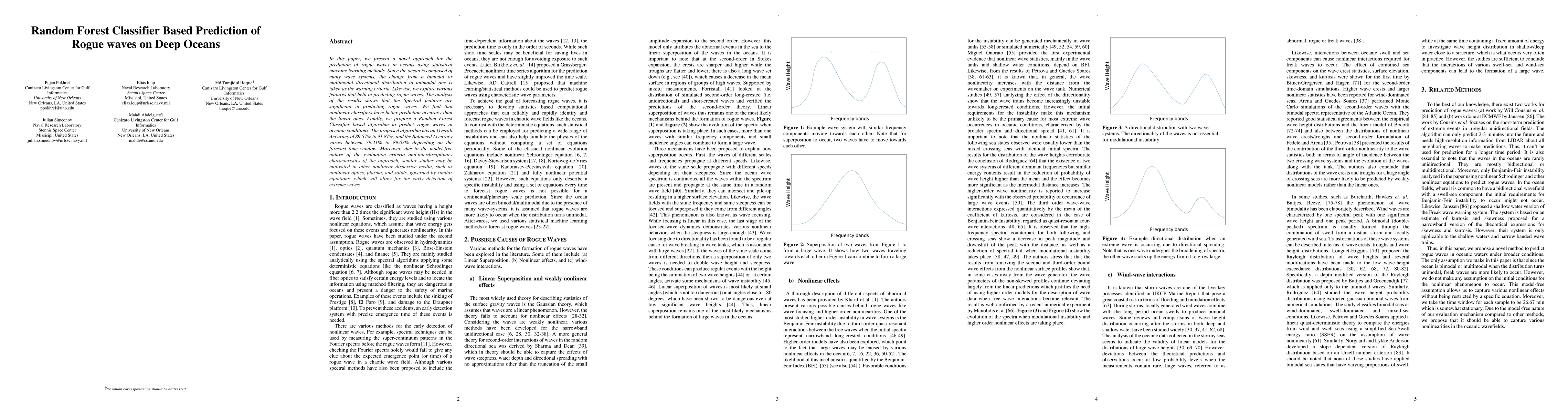 This paper introduces a Random Forest Classifier for predicting rogue waves in deep oceans using statistical machine learning. The model achieves high accuracy, with overall accuracy ranging from 89.57% to 91.81%, and is shown to be effective due to the significance of spectral features in the analysis.