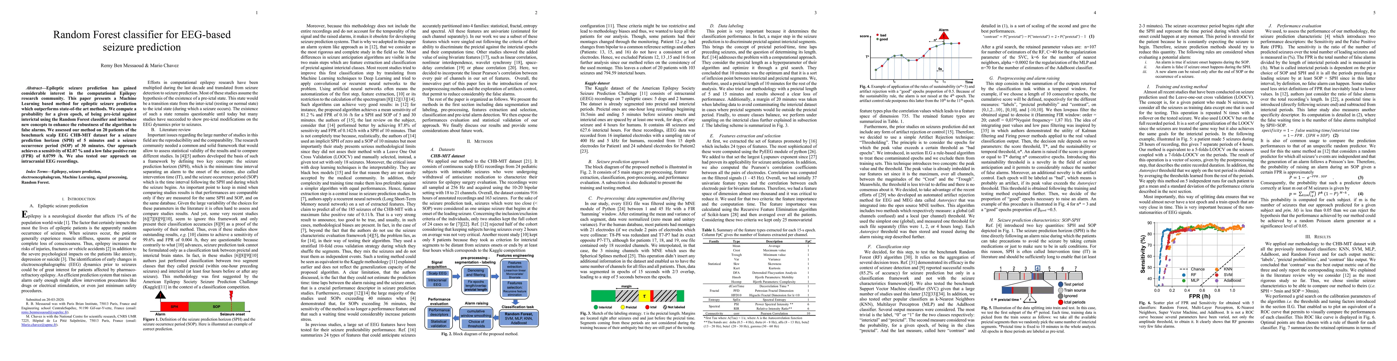 This paper proposes a Random Forest classifier for predicting epileptic seizures using EEG data, achieving higher sensitivity (82.07%) and a low false positive rate (0.0799/h) compared to existing methods. The method was tested on both scalp and intracranial EEG recordings from the CHB-MIT dataset.