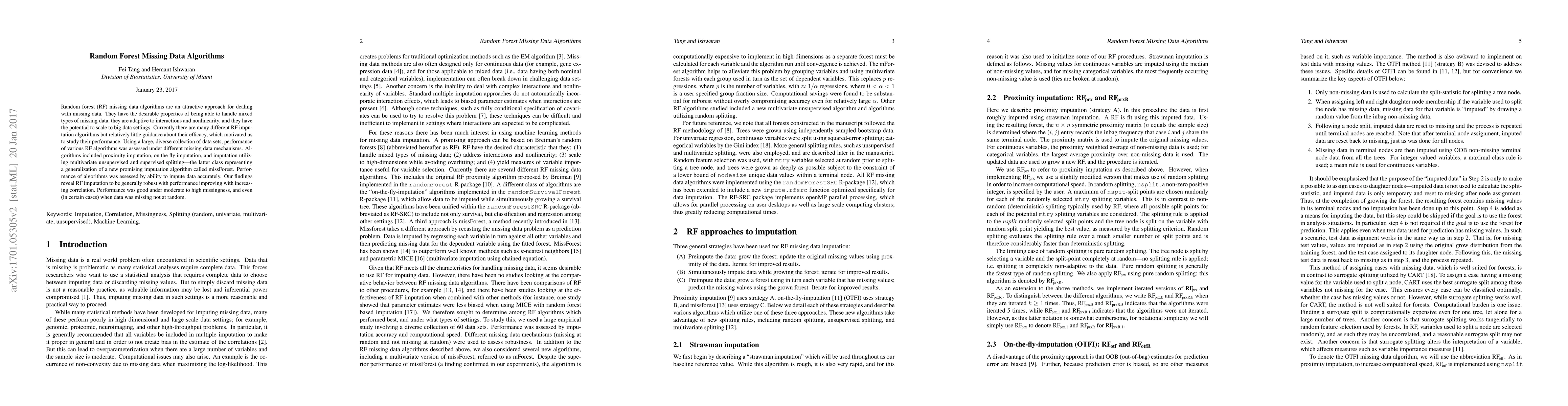 This paper evaluates the performance of various random forest (RF) imputation algorithms for handling missing data, finding them generally robust and effective, especially under moderate to high missingness and increasing correlation. The study highlights the efficacy of RF algorithms, including missForest, in diverse data settings.