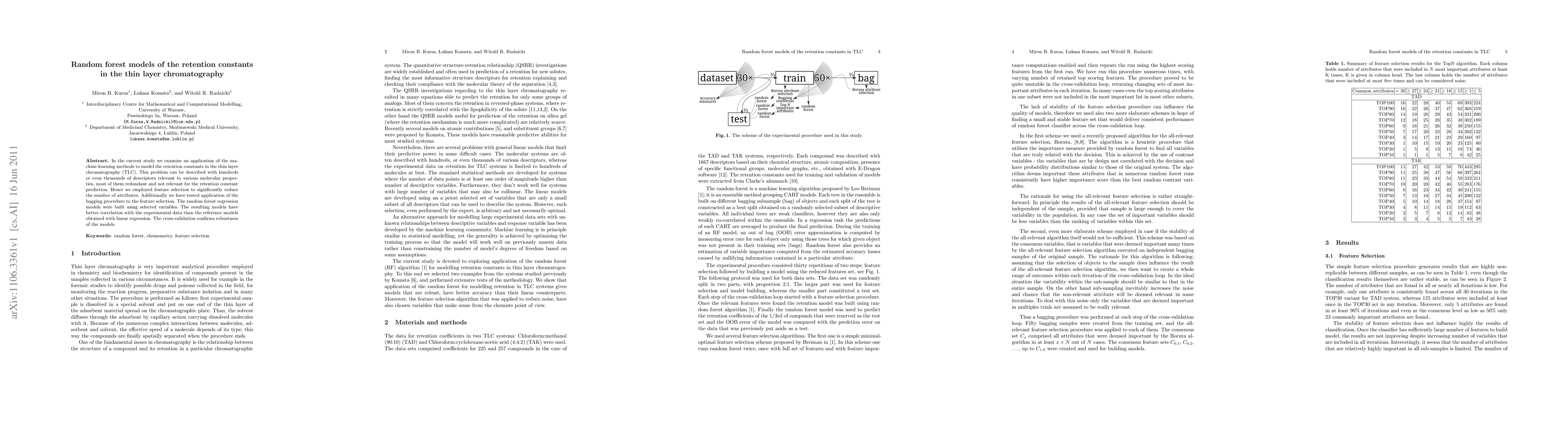 In the current study we examine an application of the machine learning methods to model the retention constants in the thin layer chromatography (TLC). This problem can be described with hundreds or even thousands of descriptors relevant to various molecular properties, most of them redundant and not relevant for the retention constant prediction. Hence we employed feature selection to significantly reduce the number of attributes. Additionally we have tested application of the bagging procedure to the feature selection. The random forest regression models were built using selected variables. The resulting models have better correlation with the experimental data than the reference models obtained with linear regression. The cross-validation confirms robustness of the models.