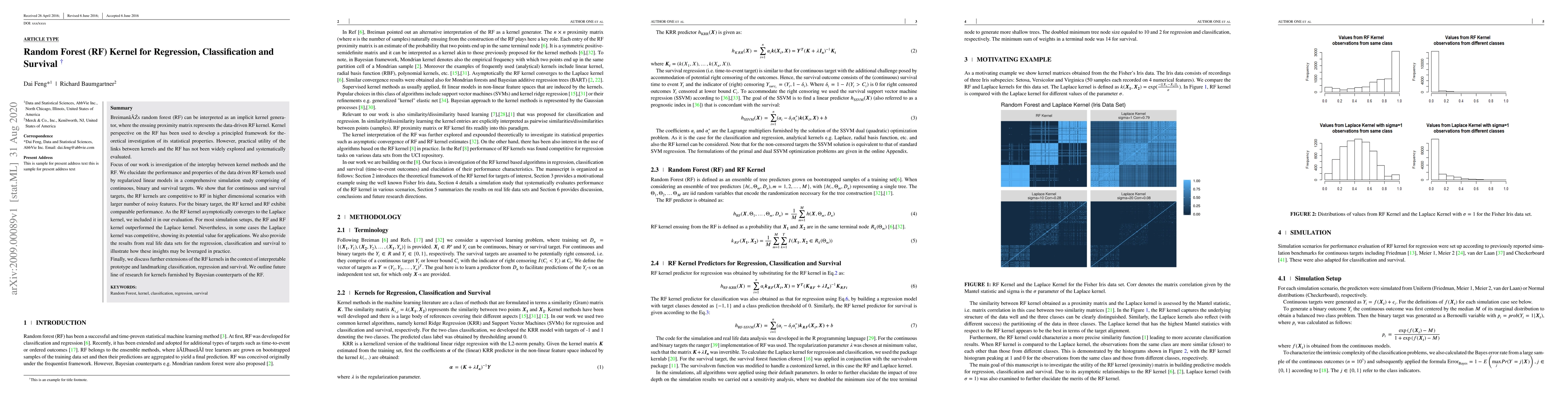 This paper explores the connection between Breiman's random forest (RF) and kernel methods, demonstrating that RF implicitly generates a data-driven kernel. The study finds that RF kernels perform competitively with RF in regression, classification, and survival analysis, especially in high-dimensional, noisy feature scenarios. The paper also highlights the potential of the Laplace kernel in some cases and discusses applications and future research directions.