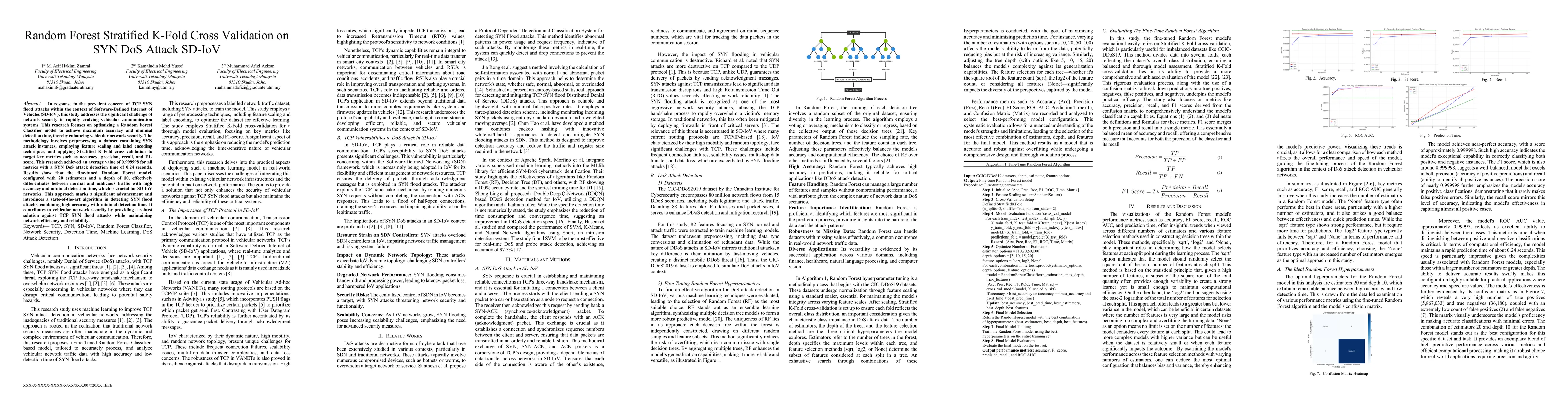 In response to the prevalent concern of TCP SYN flood attacks within the context of Software-Defined Internet of Vehicles (SD-IoV), this study addresses the significant challenge of network security in rapidly evolving vehicular communication systems. This research focuses on optimizing a Random Forest Classifier model to achieve maximum accuracy and minimal detection time, thereby enhancing vehicular network security. The methodology involves preprocessing a dataset containing SYN attack instances, employing feature scaling and label encoding techniques, and applying Stratified K-Fold cross-validation to target key metrics such as accuracy, precision, recall, and F1-score. This research achieved an average value of 0.999998 for all metrics with a SYN DoS attack detection time of 0.24 seconds. Results show that the fine-tuned Random Forest model, configured with 20 estimators and a depth of 10, effectively differentiates between normal and malicious traffic with high accuracy and minimal detection time, which is crucial for SD-IoV networks. This approach marks a significant advancement and introduces a state-of-the-art algorithm in detecting SYN flood attacks, combining high accuracy with minimal detection time. It contributes to vehicular network security by providing a robust solution against TCP SYN flood attacks while maintaining network efficiency and reliability.