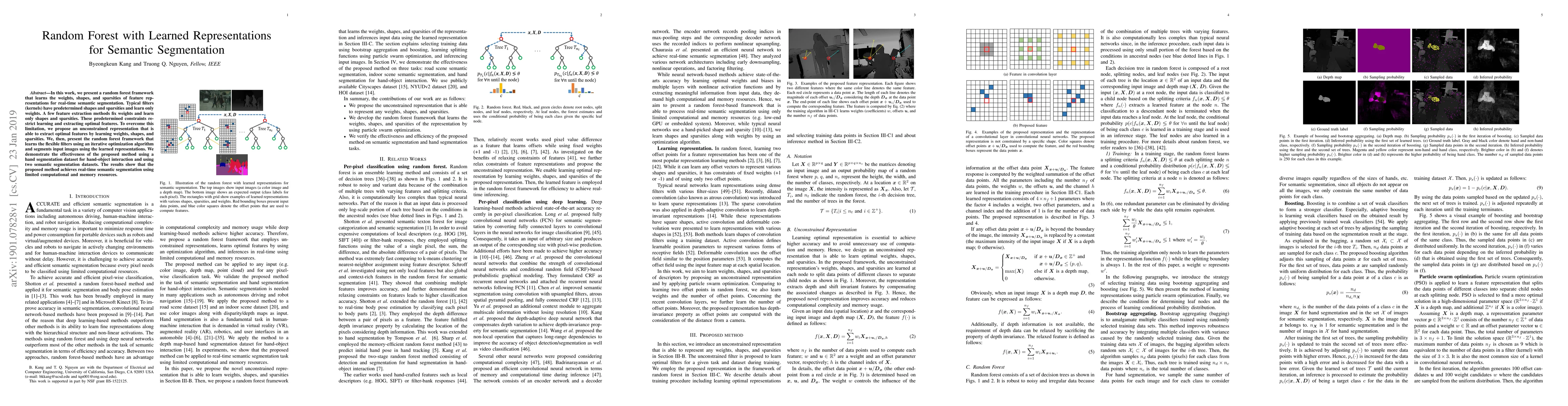 This paper proposes a random forest framework that learns optimal feature representations by adjusting weights, shapes, and sparsities, rather than relying on fixed constraints. The method achieves real-time semantic segmentation with minimal computational resources, demonstrated through segmentation datasets.