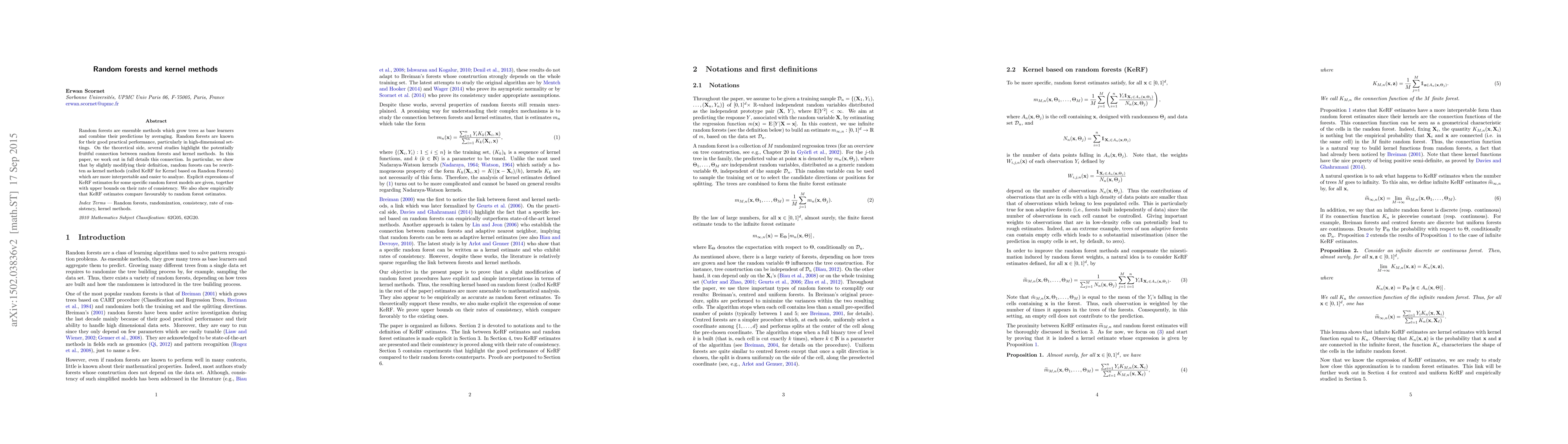 This paper explores the theoretical connection between random forests and kernel methods, demonstrating that random forests can be reformulated as kernel methods (KeRF) that are more interpretable and easier to analyze. It provides explicit expressions and consistency bounds for KeRF estimates and shows empirically that they perform competitively compared to traditional random forest estimates.