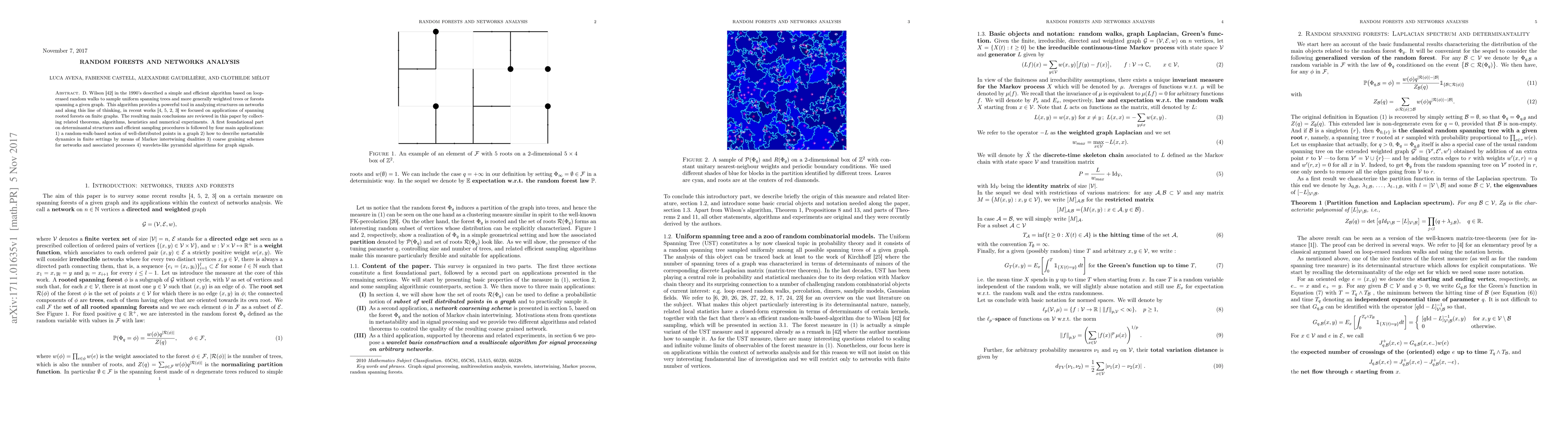 D. Wilson~\cite{[Wi]} in the 1990's described a simple and efficient algorithm based on loop-erased random walks to sample uniform spanning trees and more generally weighted trees or forests spanning a given graph. This algorithm provides a powerful tool in analyzing structures on networks and along this line of thinking, in recent works~\cite{AG1,AG2,ACGM1,ACGM2} we focused on applications of spanning rooted forests on finite graphs. The resulting main conclusions are reviewed in this paper by collecting related theorems, algorithms, heuristics and numerical experiments. A first foundational part on determinantal structures and efficient sampling procedures is followed by four main applications: 1) a random-walk-based notion of well-distributed points in a graph 2) how to describe metastable dynamics in finite settings by means of Markov intertwining dualities 3) coarse graining schemes for networks and associated processes 4) wavelets-like pyramidal algorithms for graph signals.