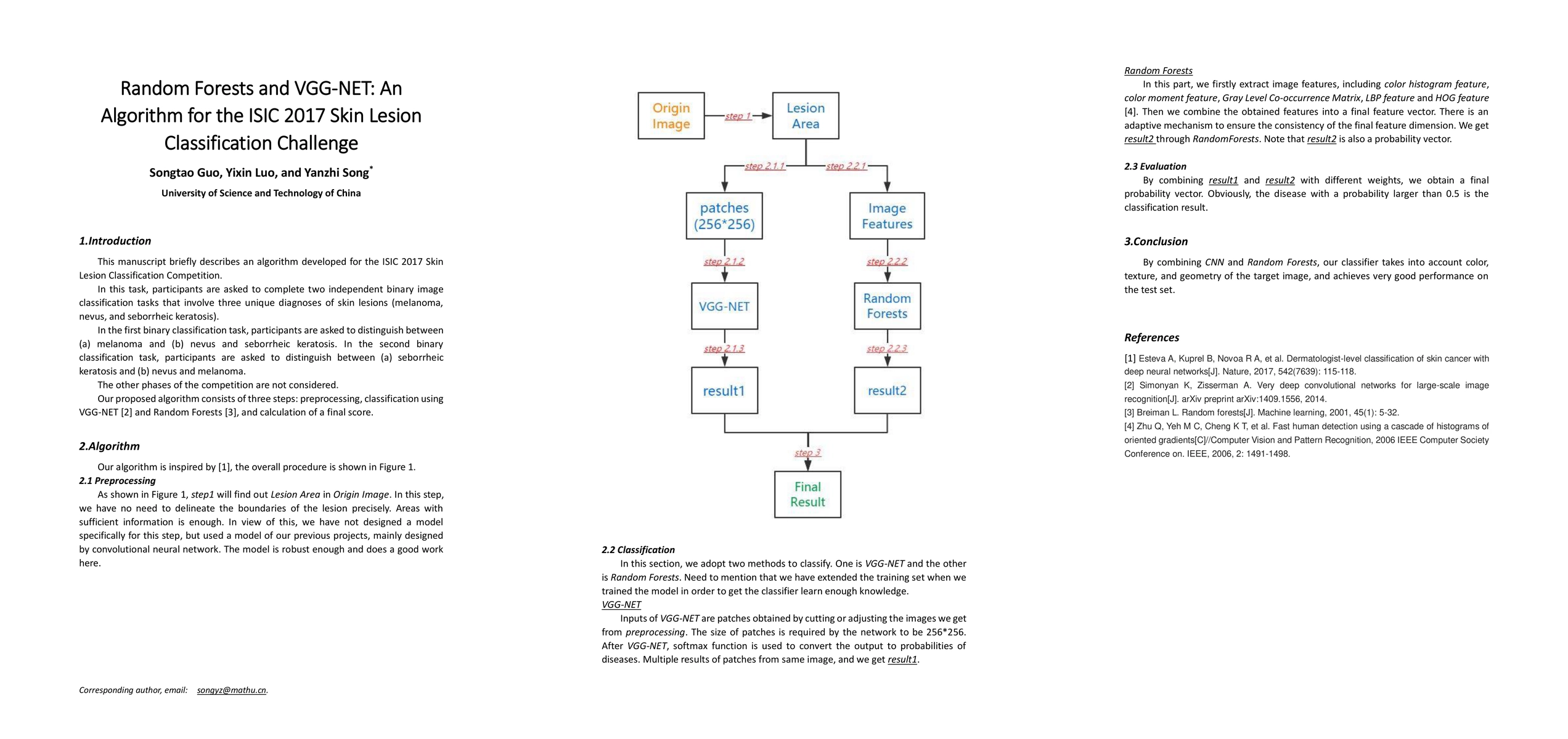 This manuscript briefly describes an algorithm developed for the ISIC 2017 Skin Lesion Classification Competition. In this task, participants are asked to complete two independent binary image classification tasks that involve three unique diagnoses of skin lesions (melanoma, nevus, and seborrheic keratosis). In the first binary classification task, participants are asked to distinguish between (a) melanoma and (b) nevus and seborrheic keratosis. In the second binary classification task, participants are asked to distinguish between (a) seborrheic keratosis and (b) nevus and melanoma. The other phases of the competition are not considered. Our proposed algorithm consists of three steps: preprocessing, classification using VGG-NET and Random Forests, and calculation of a final score.