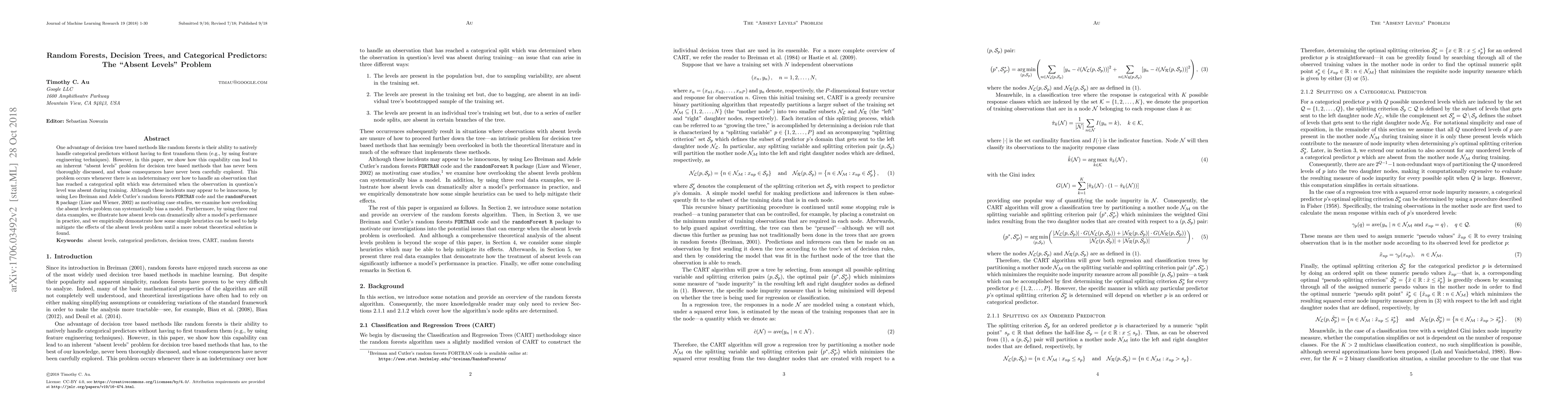 This paper discusses the "absent levels" problem in decision tree-based methods like random forests, where categorical predictors are handled natively but can lead to indeterminacy when training data lacks certain levels. The authors demonstrate how this issue can bias models and suggest simple heuristics to mitigate the problem until a theoretical solution is developed.