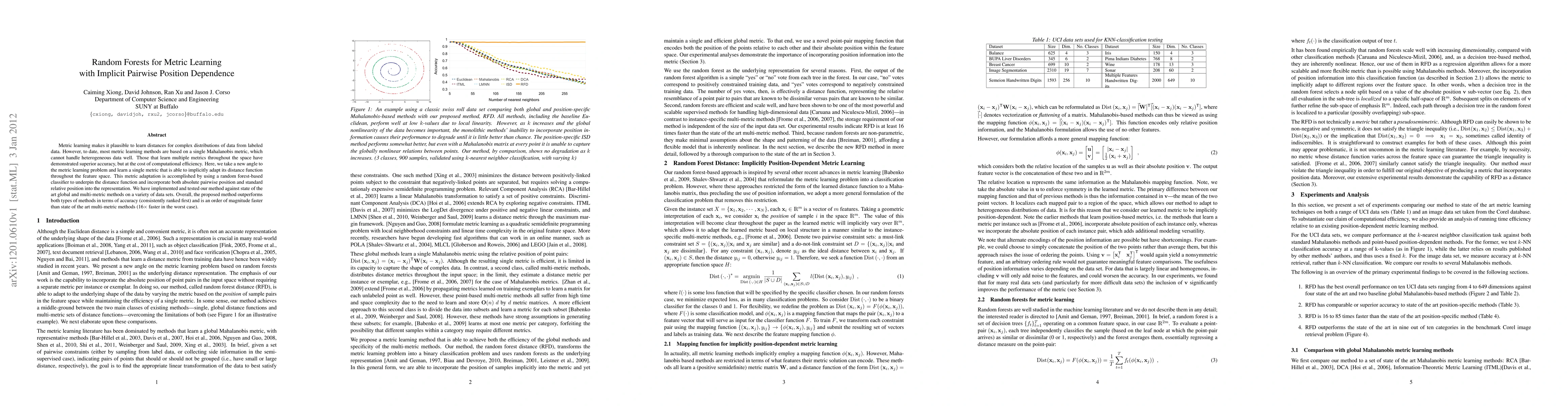 Metric learning makes it plausible to learn distances for complex distributions of data from labeled data. However, to date, most metric learning methods are based on a single Mahalanobis metric, which cannot handle heterogeneous data well. Those that learn multiple metrics throughout the space have demonstrated superior accuracy, but at the cost of computational efficiency. Here, we take a new angle to the metric learning problem and learn a single metric that is able to implicitly adapt its distance function throughout the feature space. This metric adaptation is accomplished by using a random forest-based classifier to underpin the distance function and incorporate both absolute pairwise position and standard relative position into the representation. We have implemented and tested our method against state of the art global and multi-metric methods on a variety of data sets. Overall, the proposed method outperforms both types of methods in terms of accuracy (consistently ranked first) and is an order of magnitude faster than state of the art multi-metric methods (16x faster in the worst case).