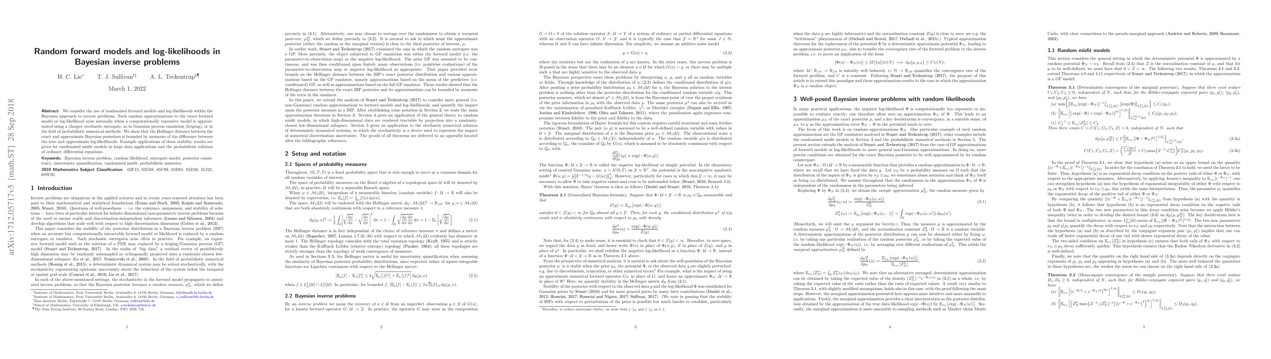 This paper explores the use of random forward models and log-likelihoods in Bayesian inverse problems, demonstrating that the Hellinger distance between exact and approximate posteriors is bounded by moments of log-likelihood differences. Applications include randomised misfit models in big data and probabilistic solutions for ordinary differential equations.