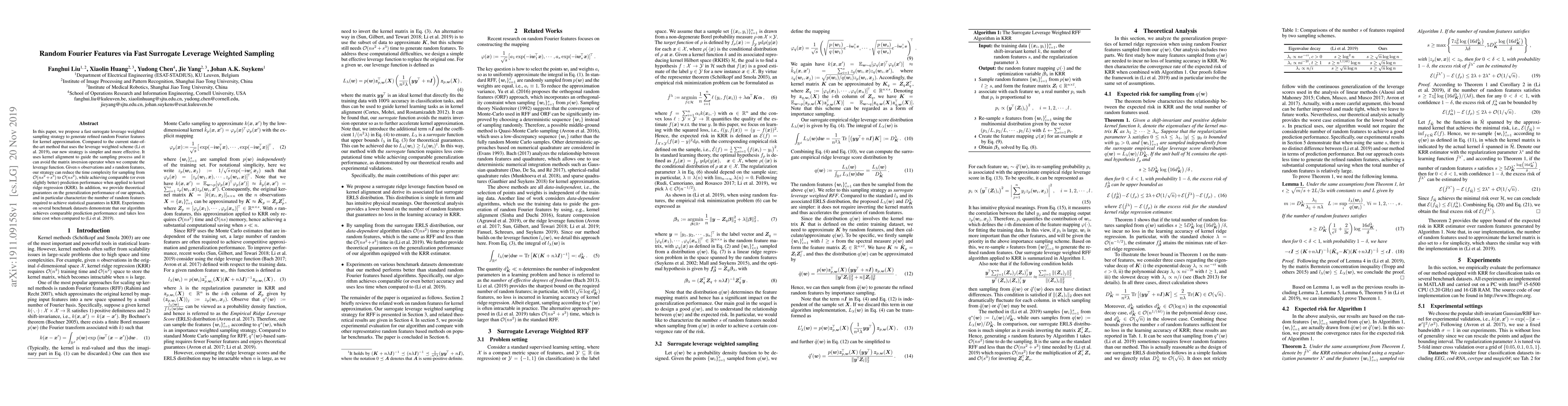 This paper proposes a fast surrogate leverage weighted sampling strategy for generating refined random Fourier features, reducing time complexity from O(ns^2+s^3) to O(ns^2) and achieving comparable prediction performance in kernel ridge regression compared to existing methods. Theoretical guarantees on generalization performance and empirical results on benchmark datasets support its effectiveness.