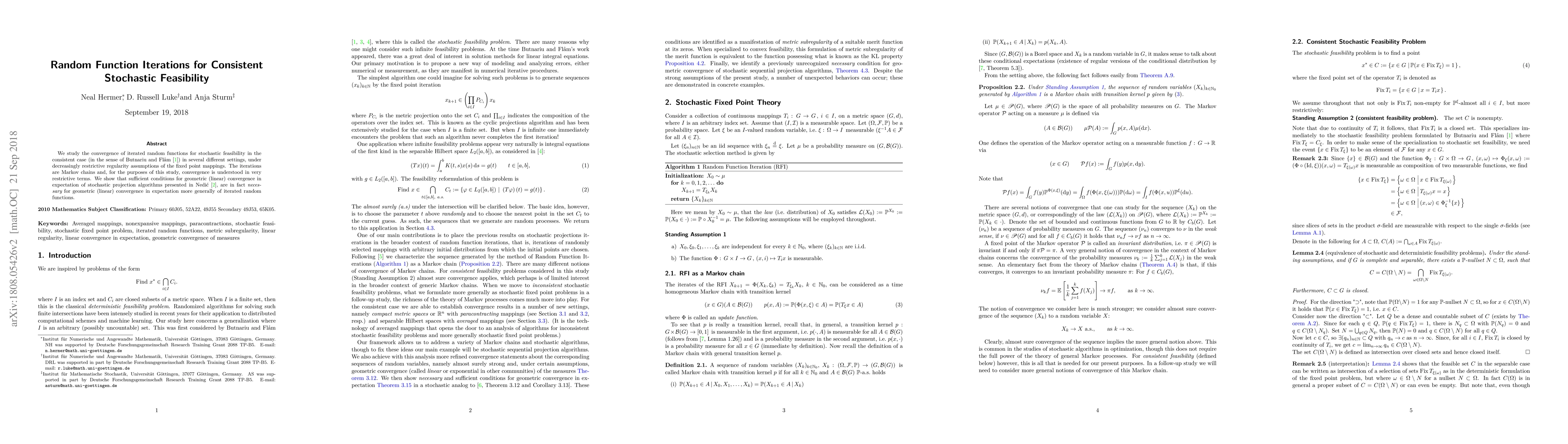 This paper investigates the convergence of stochastic fixed point iterations under minimal regularity assumptions, demonstrating that the conditions for geometric convergence in stochastic projection algorithms are also necessary for broader iterated random functions. The study focuses on Markov chain iterations in the consistent stochastic feasibility framework.