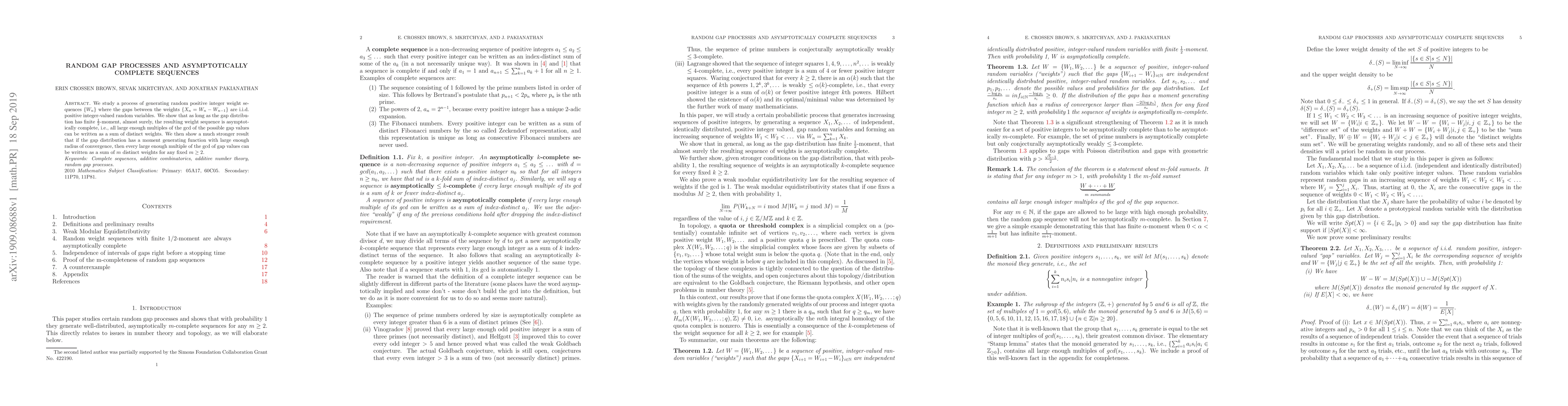 We study a process of generating random positive integer weight sequences $\{ W_n \}$ where the gaps between the weights $\{ X_n = W_n - W_{n-1} \}$ are i.i.d. positive integer-valued random variables. We show that as long as the gap distribution has finite $\frac{1}{2}$-moment, almost surely, the resulting weight sequence is asymptotically complete, i.e., all large enough multiples of the gcd of the possible gap values can be written as a sum of distinct weights. We then show a much stronger result that if the gap distribution has a moment generating function with large enough radius of convergence, then every large enough multiple of the gcd of gap values can be written as a sum of $m$ distinct weights for any fixed $m \geq 2$.