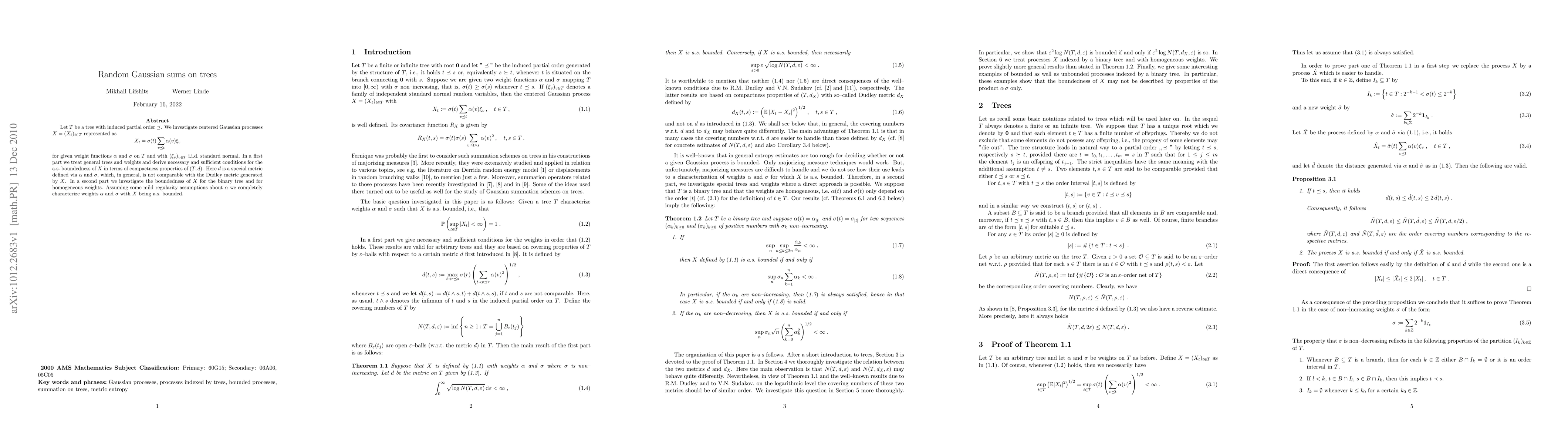 Let $T$ be a tree with induced partial order $\preceq$. We investigate centered Gaussian processes $X=(X_t)_{t\in T}$ represented as $$ X_t=\sigma(t)\sum_{v \preceq t}\alpha(v)\xi_v $$ for given weight functions $\alpha$ and $\sigma$ on $T$ and with $(\xi_v)_{v\in T}$ i.i.d. standard normal. In a first part we treat general trees and weights and derive necessary and sufficient conditions for the a.s. boundedness of $X$ in terms of compactness properties of $(T,d)$. Here $d$ is a special metric defined via $\alpha$ and $\sigma$, which, in general, is not comparable with the Dudley metric generated by $X$. In a second part we investigate the boundedness of $X$ for the binary tree and for homogeneous weights. Assuming some mild regularity assumptions about $\alpha$ we completely characterize weights $\alpha$ and $\sigma$ with $X$ being a.s. bounded.