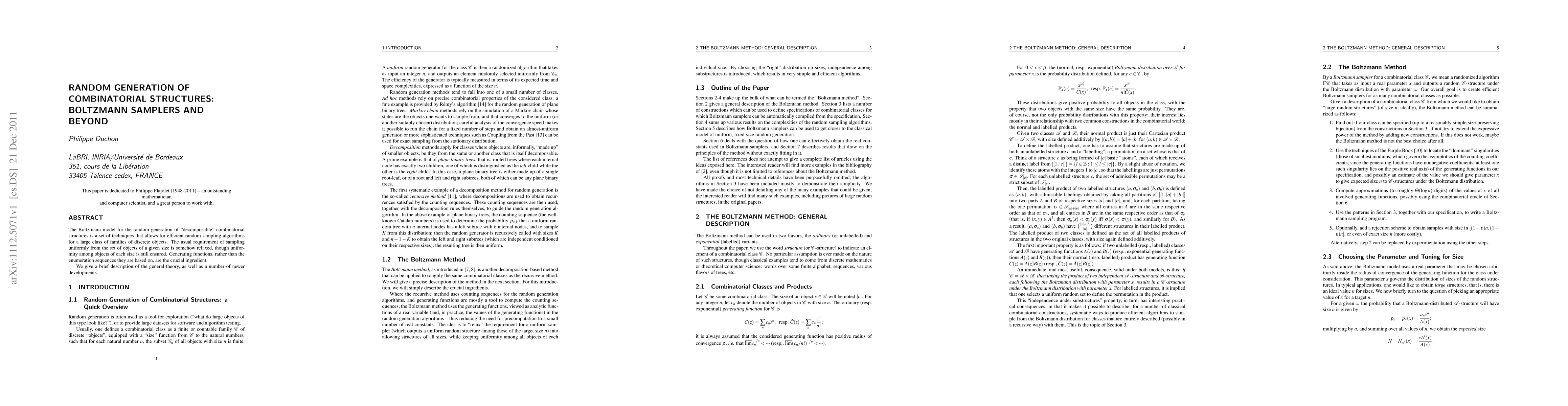 This paper discusses Boltzmann samplers for generating combinatorial structures, focusing on efficient random sampling techniques that ensure uniformity among objects of each size, using generating functions instead of enumeration sequences. It also highlights recent advancements in the field.