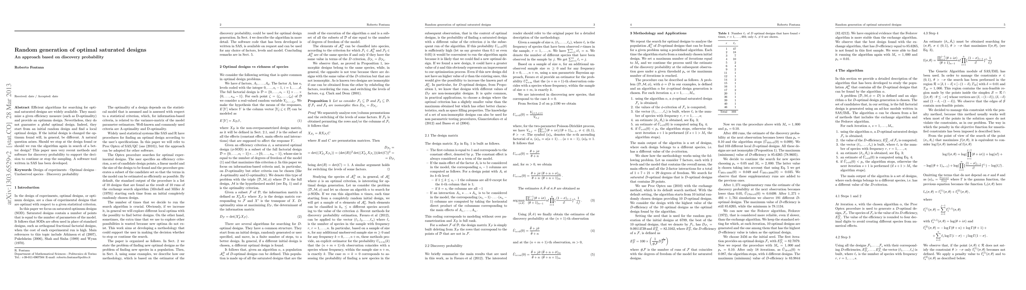 Efficient algorithms for searching for optimal saturated designs are widely available. They maximize a given efficiency measure (such as D-optimality) and provide an optimum design. Nevertheless, they do not guarantee a \emph{global} optimal design. Indeed, they start from an initial random design and find a local optimal design. If the initial design is changed the optimum found will, in general, be different. A natural question arises. Should we stop at the design found or should we run the algorithm again in search of a better design? This paper uses very recent methods and software for discovery probability to support the decision to continue or stop the sampling. A software tool written in SAS has been developed.