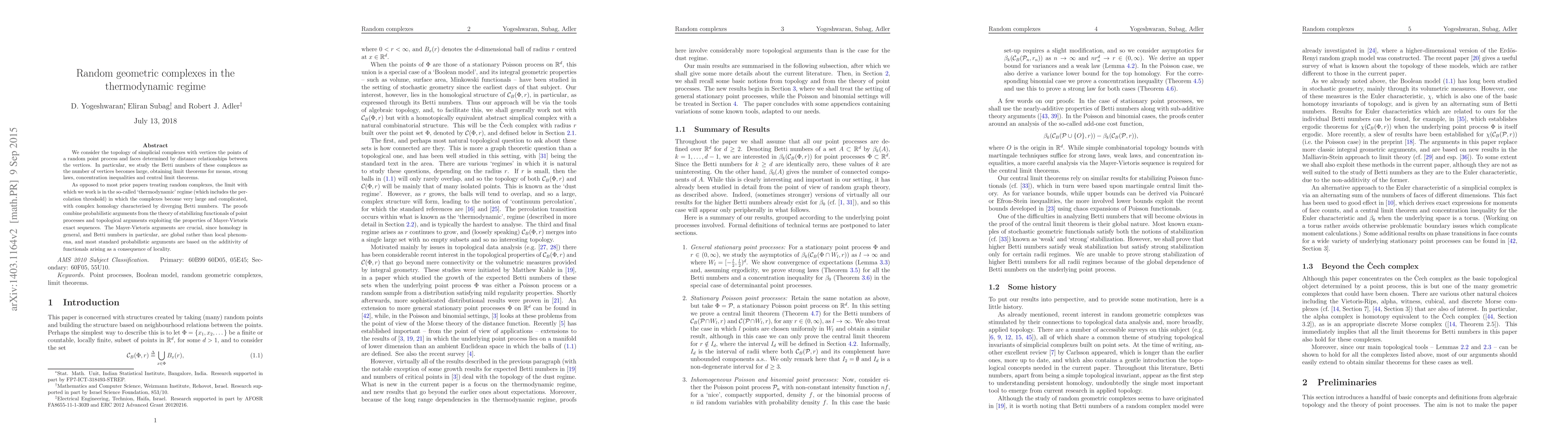 We consider the topology of simplicial complexes with vertices the points of a random point process and faces determined by distance relationships between the vertices. In particular, we study the Betti numbers of these complexes as the number of vertices becomes large, obtaining limit theorems for means, strong laws, concentration inequalities and central limit theorems. As opposed to most prior papers treating random complexes, the limit with which we work is in the so-called `thermodynamic' regime (which includes the percolation threshold) in which the complexes become very large and complicated, with complex homology characterised by diverging Betti numbers. The proofs combine probabilistic arguments from the theory of stabilizing functionals of point processes and topological arguments exploiting the properties of Mayer-Vietoris exact sequences. The Mayer-Vietoris arguments are crucial, since homology in general, and Betti numbers in particular, are global rather than local phenomena, and most standard probabilistic arguments are based on the additivity of functionals arising as a consequence of locality.