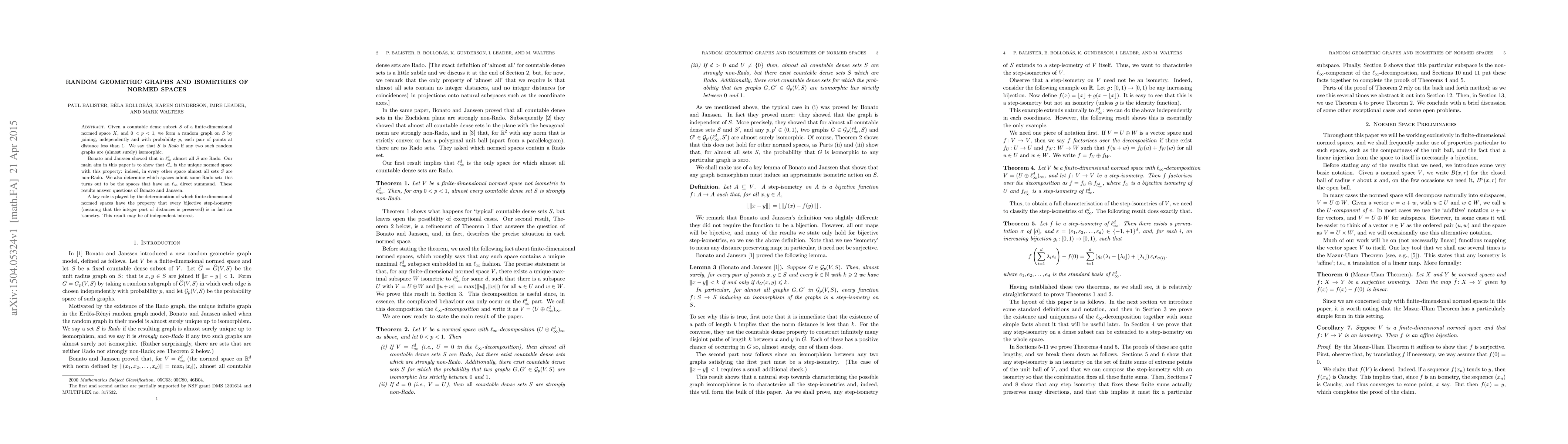 This paper investigates random geometric graphs formed by connecting points in normed spaces with a specified distance threshold, proving that $l_\infty^d$ is the only finite-dimensional normed space where almost all dense subsets are "Rado," meaning any two such random graphs are isomorphic almost surely. It also identifies which spaces have at least some Rado sets, finding that these spaces possess an $l_\infty$ direct summand.