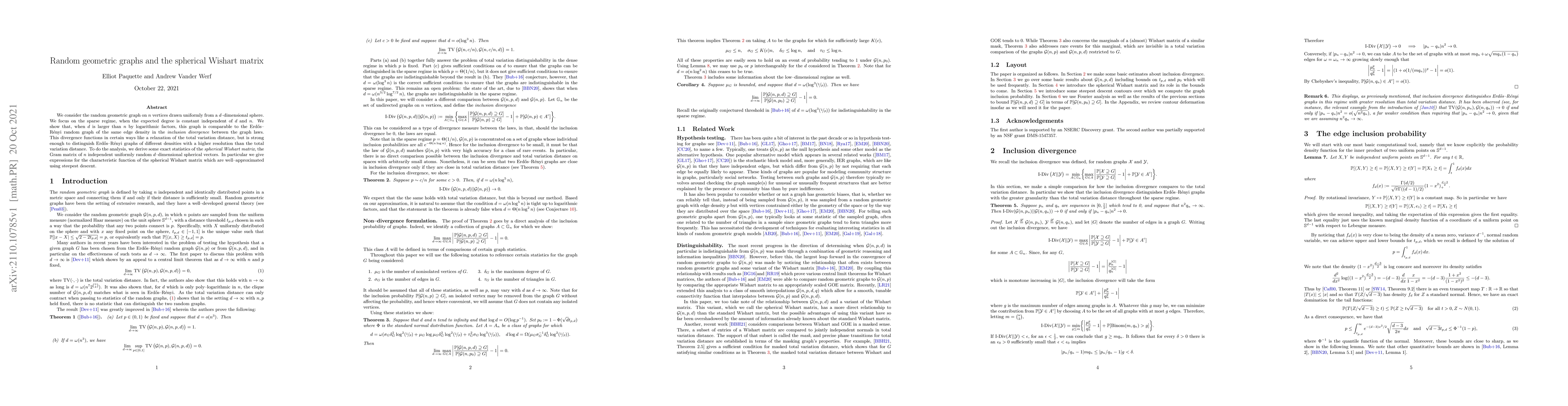 We consider the random geometric graph on $n$ vertices drawn uniformly from a $d$--dimensional sphere. We focus on the sparse regime, when the expected degree is constant independent of $d$ and $n$. We show that, when $d$ is larger than $n$ by logarithmic factors, this graph is comparable to the Erd\H{o}s--R\'enyi random graph of the same edge density in the \emph{inclusion divergence} between the graph laws. This divergence functions in certain ways like a relaxation of the total variation distance, but is strong enough to distinguish Erd\H{o}s--R\'enyi graphs of different densities with a higher resolution than the total variation distance. To do the analysis, we derive some exact statistics of the \emph{spherical Wishart matrix}, the Gram matrix of $n$ independent uniformly random $d$--dimensional spherical vectors. In particular we give expressions for the characteristic function of the spherical Wishart matrix which are well--approximated using steepest descent.