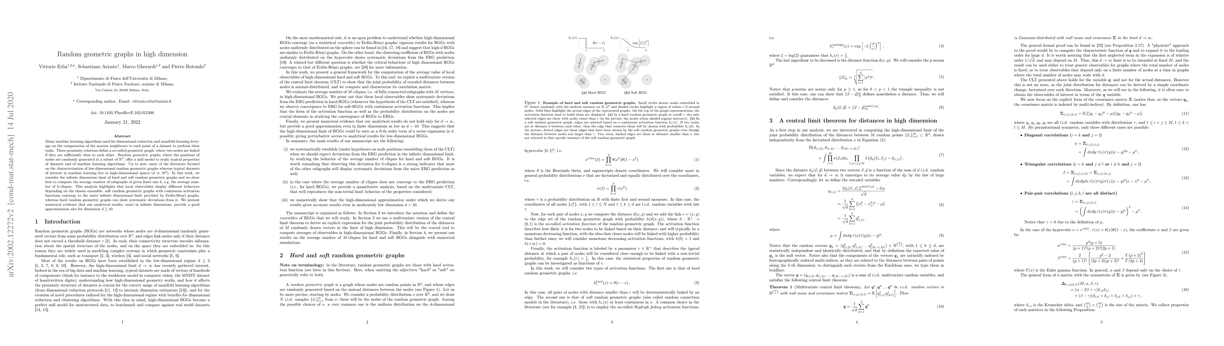 This paper studies the properties of random geometric graphs in high dimensions, focusing on both hard and soft ensembles. It finds that soft graphs converge to an infinite-dimensional Erdős-Rényi limit, while hard graphs deviate, and provides analytical and numerical evidence for these behaviors, showing good approximation even for moderately high dimensions.