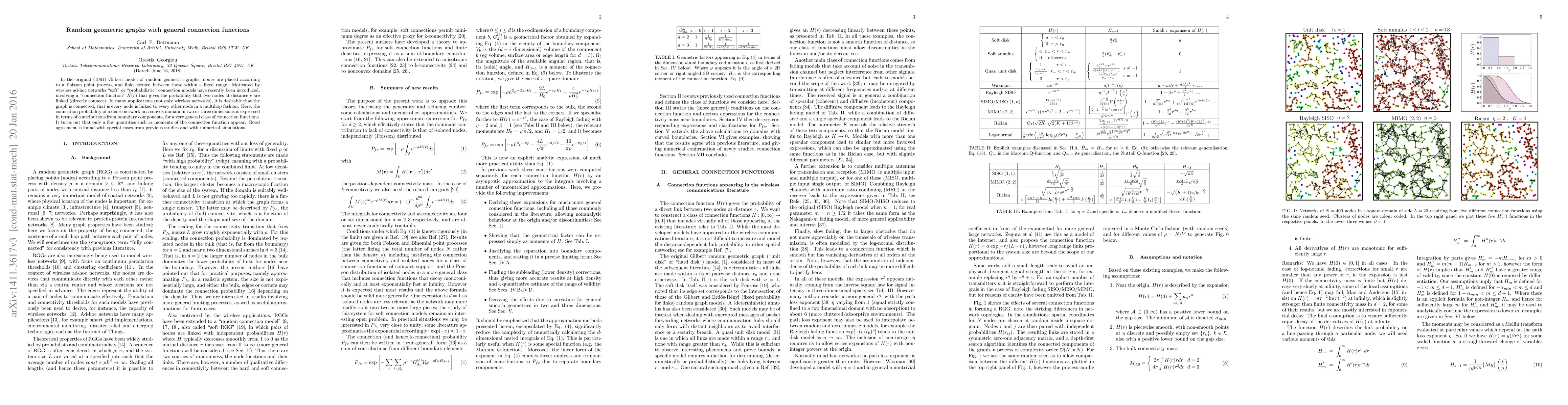 This paper develops a general framework for modeling random geometric graphs with probabilistic connection functions in 2D and 3D spaces, enabling connected networks and good agreement with previous studies and simulations.