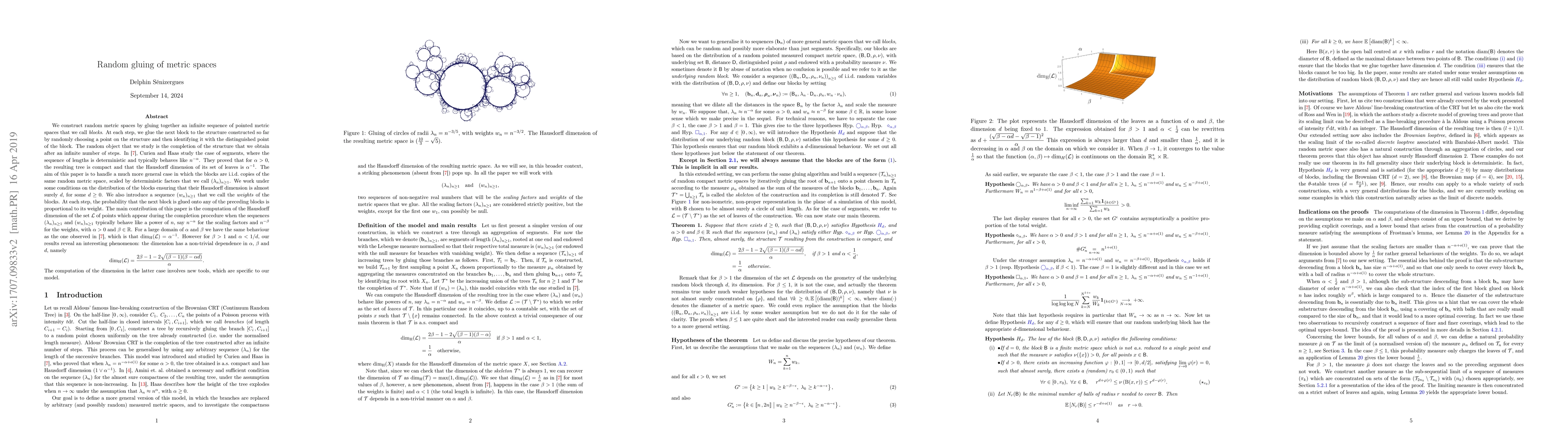 We construct random metric spaces by gluing together an infinite sequence of pointed metric spaces that we call blocks. At each step, we glue the next block to the structure constructed so far by randomly choosing a point on the structure and then identifying it with the distinguished point of the block. The random object that we study is the completion of the structure we obtain after an infinite number of steps. We introduce a sequence $(w_n)_{n\geq1}$ that we call the weights of the blocks. The probability at each step that the next block is glued onto any of the preceding blocks is proportional to its weight. We suppose that the blocks are i.i.d. copies of the same random metric space, scaled by deterministic factors that we call $(\lambda_n)_{n\geq 1}$. We work under some conditions on the distribution of the blocks ensuring that they a.s. have dimension $d$, for some $d>0$. The main contribution of this paper is the computation of the Hausdorff dimension of the set $\mathcal{L}$ of points which appear during the completion procedure, which we call the leaves, when $(\lambda_n)_{n\geq 1}$ and $(w_n)_{n\geq1}$ typically behave like a power of $n$, say $n^{-\alpha}$ for the scaling factors and $n^{-\beta}$ for the weights. For a large domain of $\alpha$ and $\beta$, we have $\mathrm{dim_H}(\mathcal{L})=\alpha^{-1}$. However for $\beta>1$ and $\alpha<1/d$, our results reveal an interesting phenomenon: the dimension has a non-trivial dependence in $\alpha$, $\beta$ and $d$, namely $\mathrm{dim_H}(\mathcal{L})=\alpha^{-1}(2\beta-1-2\sqrt{(\beta-1)(\beta-d\alpha)})$.}