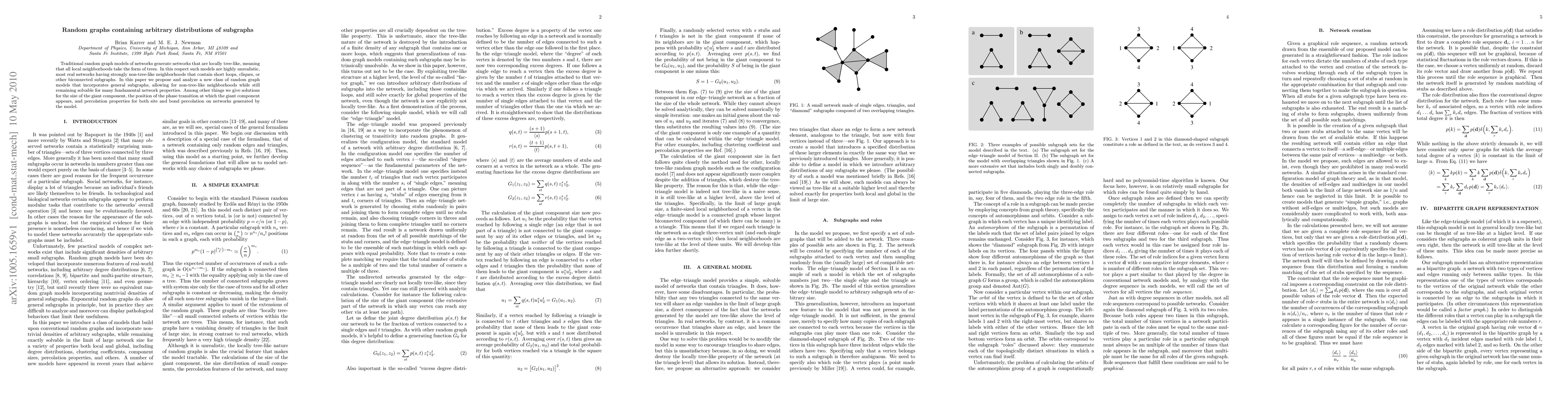 Traditional random graph models of networks generate networks that are locally tree-like, meaning that all local neighborhoods take the form of trees. In this respect such models are highly unrealistic, most real networks having strongly non-tree-like neighborhoods that contain short loops, cliques, or other biconnected subgraphs. In this paper we propose and analyze a new class of random graph models that incorporates general subgraphs, allowing for non-tree-like neighborhoods while still remaining solvable for many fundamental network properties. Among other things we give solutions for the size of the giant component, the position of the phase transition at which the giant component appears, and percolation properties for both site and bond percolation on networks generated by the model.