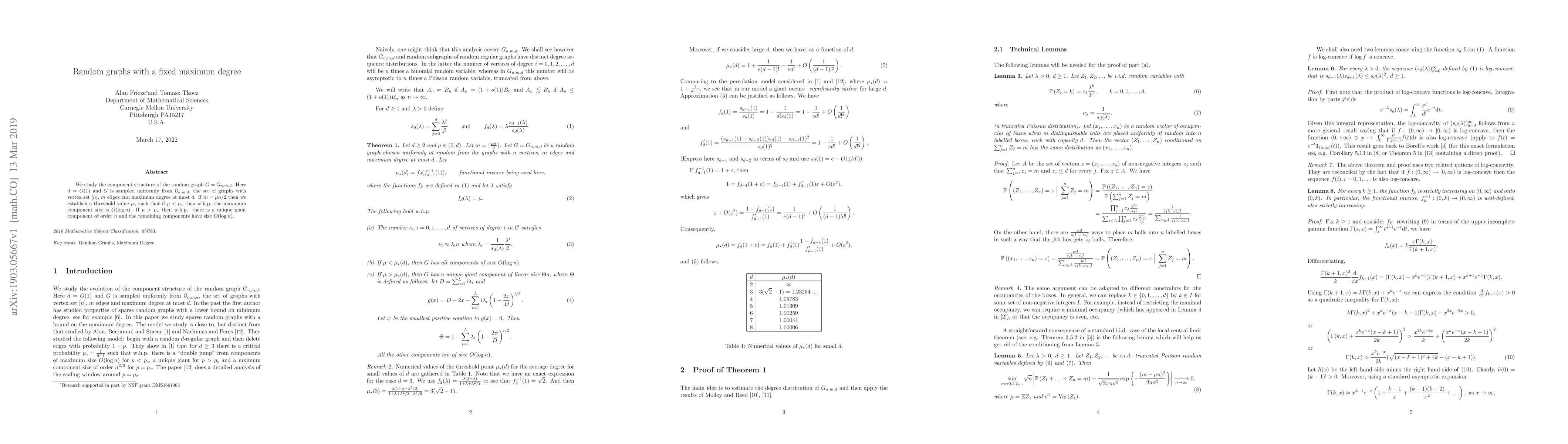 Researchers studied a type of random graph with a fixed maximum degree, finding that if a certain ratio of edges is reached, the largest component's size grows logarithmically with the number of vertices, while above this threshold, a giant component emerges.