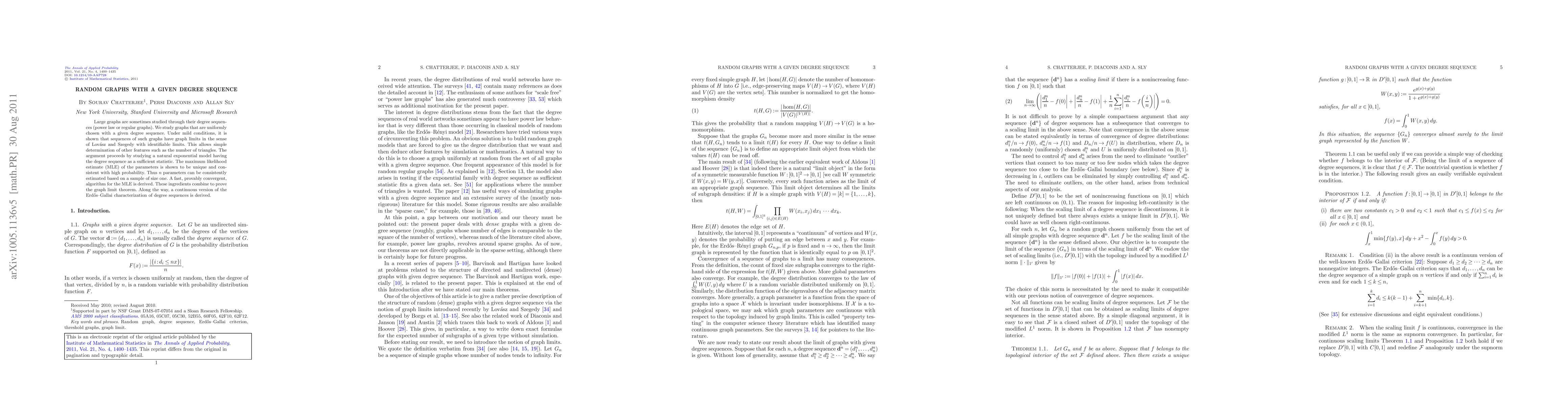 This paper studies uniformly chosen random graphs with a specified degree sequence, demonstrating that such graphs converge to identifiable limits under mild conditions. The study employs an exponential model to derive a fast, convergent algorithm for maximum likelihood estimation, enabling the determination of graph features like the number of triangles.